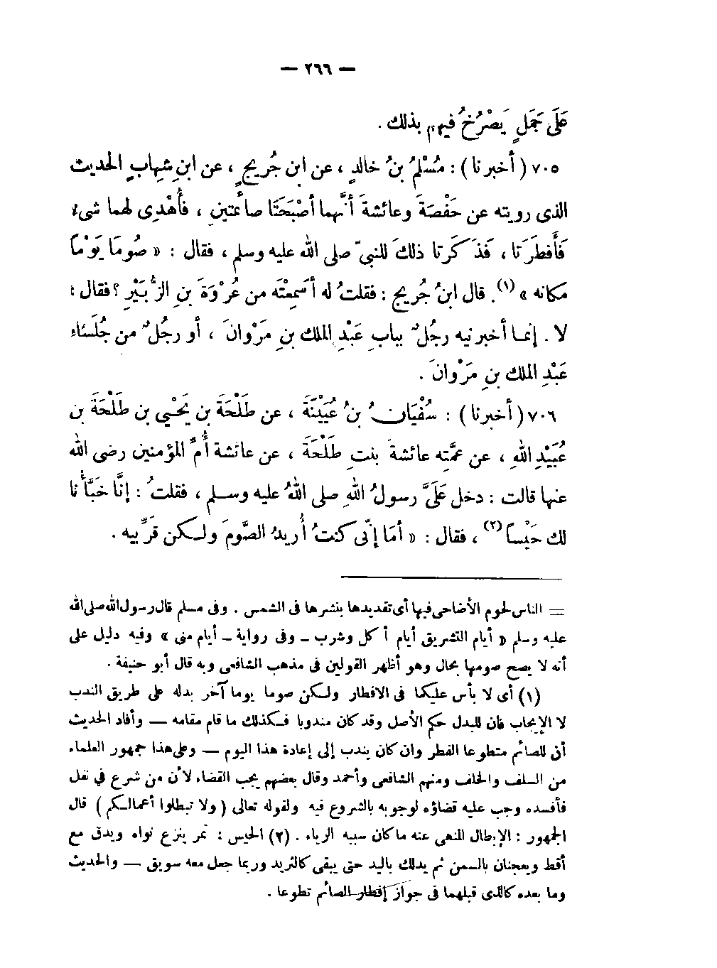 - الحديث الذي رويته عن حَفْصَةَ وعائشةَ أنَّهما أصْبَحَتَا صائمتينِ فأُهْدِيَ لهما شئٌ فَأَفْطَرَتَا فَذَكَرتا ذلكَ للنبي صلى اللَّهُ عليهِ وسلم فقال: «صُومَا يَوْماً مكانه» (أي لا بأس عليكما في الإفطار ولكن صوما يوما آخر بدله عن طريق الندب لا الإيجاب فان للبدل حكم الأصل وقد كان مندوبا فكذلك ما قام مقامه وأفاد الحديث أن للصائم متطوعا الفطر وإن كان يندب إعادة هذا اليوم وعلى هذا جمهور العلماء من السلف والخلف ومنهم الشافعي وأحمد وقال بعضهم يجب القضاء لأن من شرع في نفل فأفسده وجب عليه قضاؤه لوجوبه بالشروع فيه ولقوله تعالى (ولا تبطلوا أعمالكم) قال الجمهور: الإبطال المنهي عنه ما كان سببه الرياء) قال ابنُ جَرَيْج: فقلتُ له أسَمِعْتَهُ من عُرْوَةَ بنِ الزُّبَيْرِ؟ فقال: لا إنما أخبرنيه رجُلٌ ببابِ عَبْدِ الملك بنِ مَرْوانَ أو رجُلٌ من جُلَساءِ عَبْدِ الملك بنِ مَرْوانَ.
