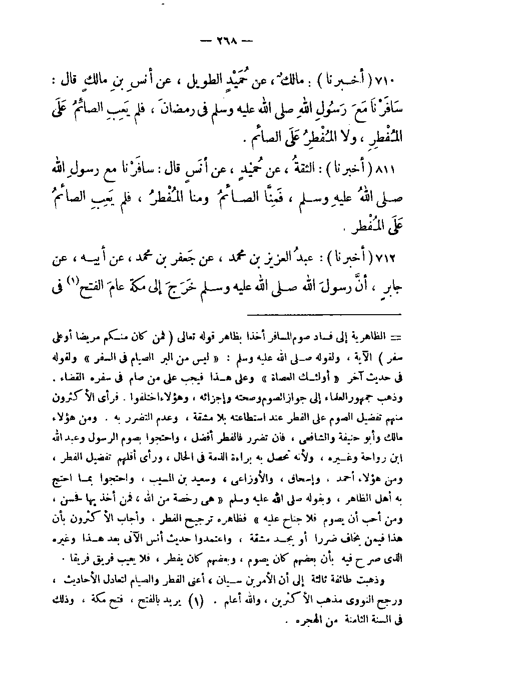 -أنَّ رسول اللَّه صلى اللَّه عليه وسلم خَرَجَ إلى مكة عَامَ الفتح (يريد بالفتح فتح مكة وذلك في السنة الثامنة من الهجرة) في -[269]- رَمضَانَ فَصام حتى بَلَغَ كُرَاعَ الغَمِيمْ (في معجم البلدان: كراع الغميم «بضم الكاف وفتح الغين» موضع بالحجاز بين مكة والمدينة وهو واد أمام عسفان كعثمان بثمانية أميال وهذا الكراع جبل أسود في طرف الحرة يمتد إليه) فصام الناسُ معه فقِيلَ له يا رسولَ اللَّه: إنَّ الناسَ قَدْ شَقَّ عليهم الصيامُ فَدَعا بِقَدَح من ماء بعدَ العصرِ فَشَرِبَ وَالناسُ يَنْظُرُونَ فَأَفطَرَ بعضُ الناسِ وصامَ بعضٌ فَبَلَغَهُ أنَّ نَاساً صامُوا فقال: «أؤلئكَ العُصَاةُ» (هذا الحديث يقوي مذهب الأكثرين القائل بترجيح الصيام في السفر إلا إذا كان هناك مشقة أو تضرر فيترجح الفطر فإن الرسول صلى اللَّهُ عليه وسلم حين علم أن الناس قد شق عليهم الذيام شرب أمامهم وأفطر ليفطروا مثله وقال لمن لم يتابعه في فطره «أولئك العصاة» وإنما سماهم عصاة لعدم فطرهم مع تضررهم بالصوم ولأنهم كانوا ذاهبين إلى فتح مكة ومجاهدة الأعداء وهذا يضعفهم ويعرضهم للهزيمة ولذا قال الرسول صلى اللَّهُ عليه وسلم في الحديث الذي يلي هذا: «تقووا لعدوكم» ولا يلزم من نعته إياهم بالعصاة فساد صومهم وغاية ما؟؟ أنه خلاف الأفضل والأولى) .