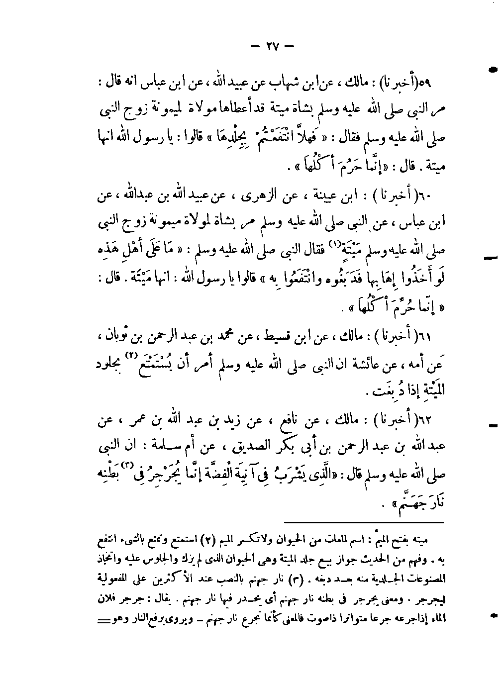 -مر النبي صلى الله عليه وسلم بشاة ميتة قد أعطاها مولاة لميمونة زوج النبي صلى اللَّه عليه وسلم فقال: «فَهلاَّ انْتَفَعْتُمْ بِجِلْدِهَا» قالوا: يا رسول اللَّه انها ميتة. قال: «إِنَّما حَرُمَ أكْلُهَا» .