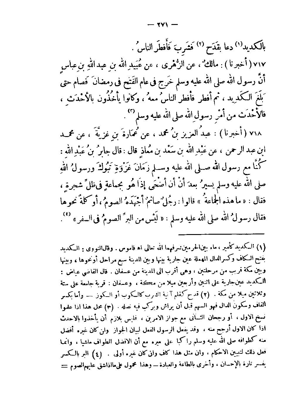 -أنَّ رسول اللَّه صلى اللَّهُ عليه وسلم خَرج في عام الفتح فى رمضانَ فَصام حتى بَلَغَ الكَدِيد ثم أفطر فأفطر الناسُ معهُ وكانوا يأخُذُون بالأحْدَثِ فالأحْدَث من أمْرِ رسولِ اللَّه صلى اللَّه عليه وسلم (محل هذا إذا علموا نسخ الأول أو رجحان الثاني مع جواز الأمرين فليس بلازم أن يأخذوا بالأحدث إذا كان الأول أرجح منه وقد يفعل الرسول الفعل لبيان الجواز وإن كان غيره أفضل منه كطوافه صلى اللَّه عليه وسلم راكبا على بعيره مع أن الأفضل الطواف ماشيا وإنما فعل ذلك لتبيين الأحكام وإن مثل هذا كاف وإن كان غيره أولى) .