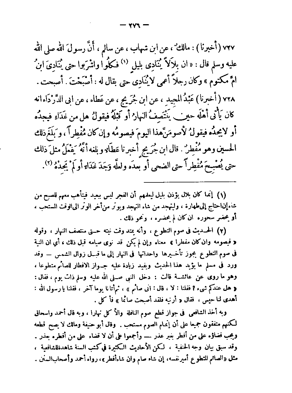 -أنَّ رسول اللَّه صلى اللَّه عليه وسلم قال: «إنَّ بِلالا ينَادِي بِلَيْلٍ (إنما كان بلال يؤذن بليل ليعلمهم أن الفجر ليس ببعيد فيتأهب معهم للصبح من شاء إن احتاج إلى طهارة وليتهجد من شاء التهجد ويوتر من أخر الوتر إلى الوقت المستحب أو يحضر سحوره إن كان لم يحضره ونحو ذلك) فكُلوا واشْرَبوا حتى يُنَادِيَ ابنُ أمِّ مكْتوم» وكان رجلاً أعمى لا يُنَادِي حتى يُقَالَ له: أَصْبَحْتَ أصبحت.
