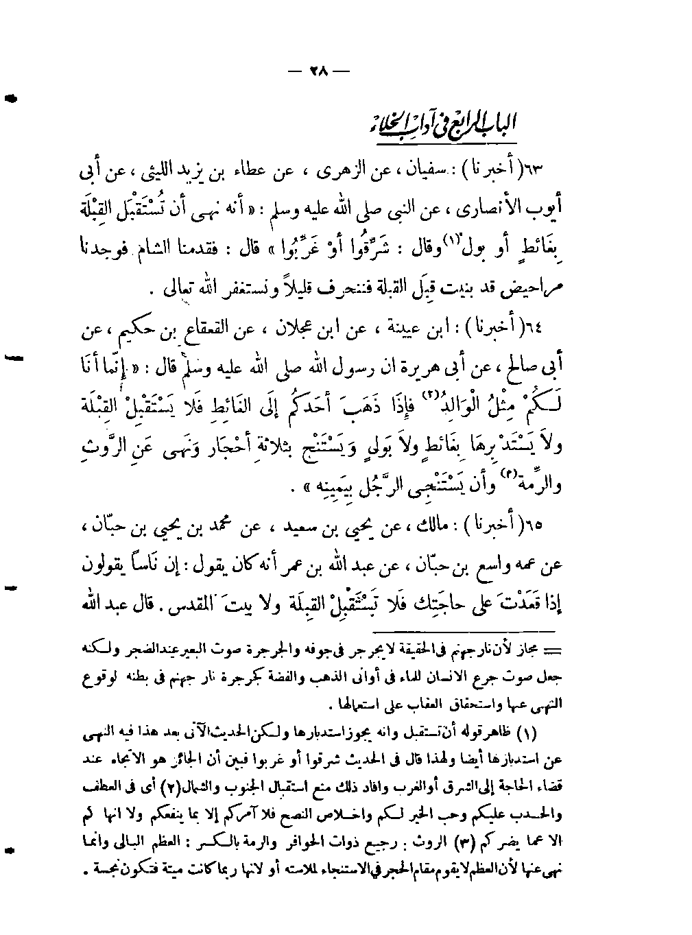-عن النبي صلى اللَّه عليه وسلم: «أنه نهى أن تُسْتَقْبَلَ الْقِبْلَة بِغائِطْ أَو بَول (ظاهر قوله أن تستقبل وأنه يجوز استدبارها ولكن الحديث الآني بعد هذا فيه النهي عن استدبارها أيضا ولهذا قال في الحديث شرقوا أو غربوا فبين أن الجائز هو الاتجاه عند قضاء الحاجة الى الشرق أو الغرب وافاد ذلك منع استقبال الجنوب والشمال) وقال شَرِّقُوا أوْ غَرِّبُوا» قال فقدمنا الشام فوجدنا مراحيض قد بنيت قِبَل القبلة فننحرف قليلاً ونستغفر اللَّه تعالى.