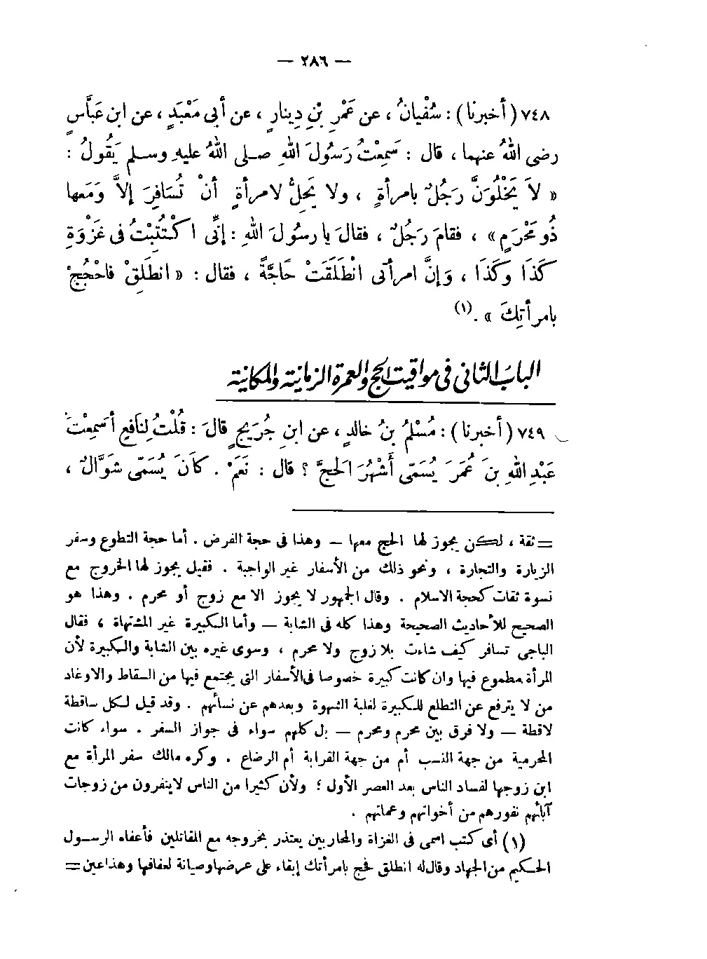 -سَمِعْتُ رسولَ اللَّهِ صلى اللَّهُ عليهِ وسلم يَقُولُ: «لاَ يَخْلُوَنَّ رَجُلٌ بامرأةٍ ولا يَحِلُّ لامرأةٍ أنْ تُسَافِرَ إلاَّ ومَعَها ذُو مَحْرَمٍ» فقامَ رجُلٌ فقالَ يا رسُولَ اللَّهِ: إنِّي اكْتَتَبْتُ في غَزْوَةِ كذا وكذا وَإنَّ امرأتي انْطَلَقَتْ حَاجَّةً فقال: انطَلِقْ فاحْجُجْ بامرأتِكَ (أي كتب إسمي في الغزاة والمحاربين يعتذر بخروجه مع المقاتلين فأعفاه الرسول الحكيم من الجهاد وقال له انطلق فحج بامرأتك إبقاء على عرضها وصيانة على عفافها وهذاعين الحكمة ولاصواب فإن المرأة ضعيفة الأعصاب سريعة الإنقياد والرجال كالذئاب في الختل والخداع فما أسرع ما تقع المرأة في حبائلهم وتنقاد لحيلهم ودهائهم وأن الذين يطالبون بحرية المرأة في سفرها واختلاطها لمغرورون أو مفرطون والمرأة مهما تعلمت ضعيفة بازاء الرجل فلا يصونها إلا بعدها أو مرافقة المحارم لها في أسفارها) ".