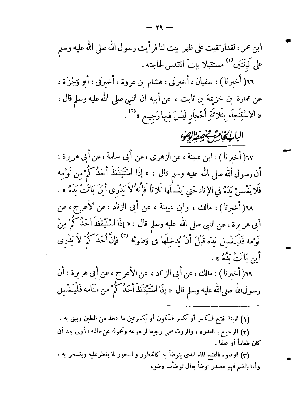 -عن النبي صلى اللَّه عليه وسلم قال: «إذَا اسْتَيْقَظَ أَحَدُكُمْ مِنْ نَوْمِه فَلْيَغْسِل يَدَه قَبْلَ أَنْ يُدْخِلَها في وَضوئه (بالفتح الماء الذي يتوضأ به كالفطور والسحور لما يفطر عليه ويتسحر به وأما بالضم فهو مصدر توضأ يقال توضأت وضوء.) فإنَّ أحَدَكُمْ لاَ يَدْرِي أين باتتْ يَدُهُ» .