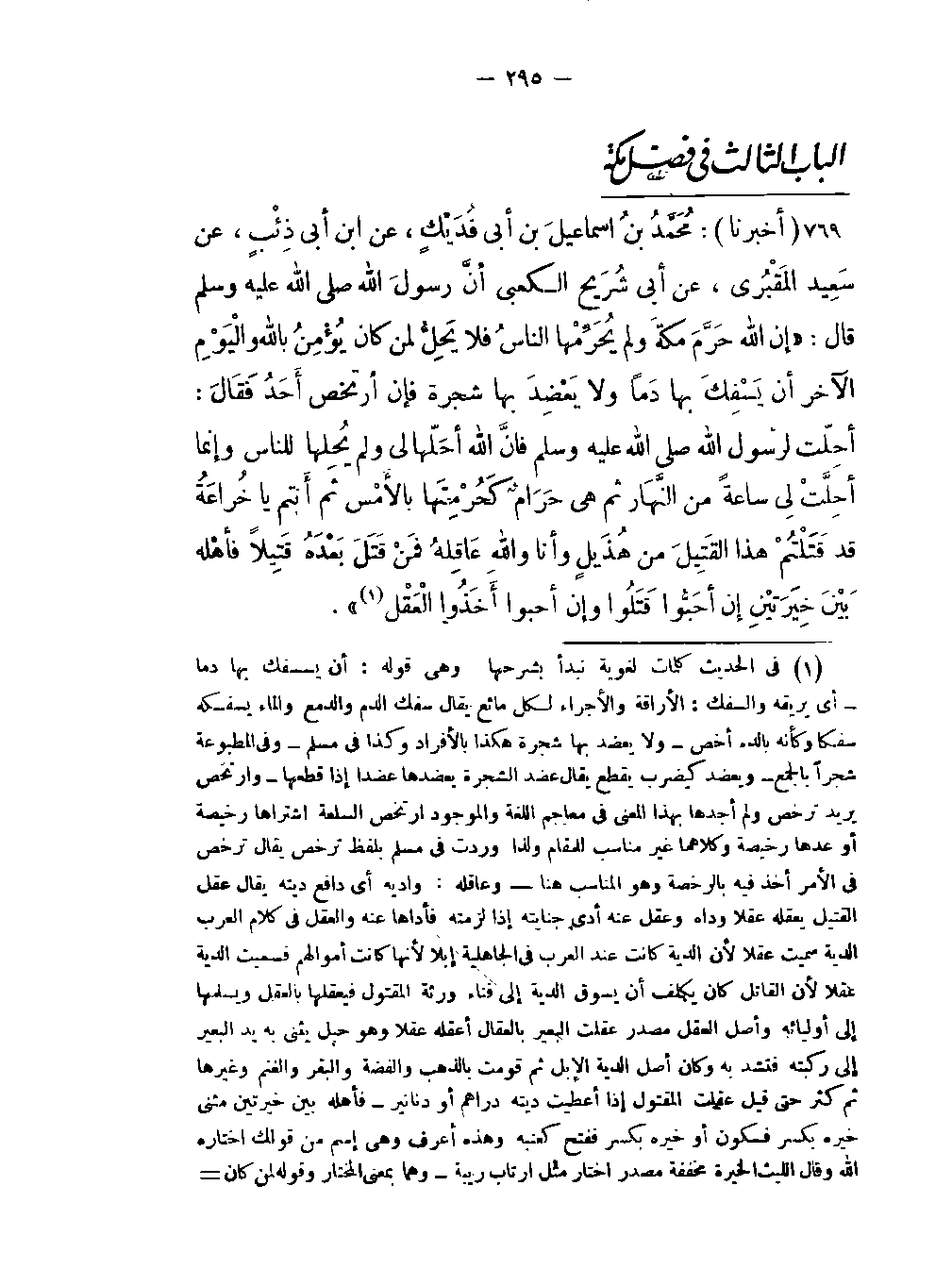 -أنَّ رسولَ اللَّهِ صلى اللَّهُ عليهِ وسلم قال: "إن اللَّه حَرَّمَ مكةَ ولم يُحَرِّمْها الناسُ فلا يَحِلُّ لمن كان يُؤْمِنُ باللَّه والْيَوْمِ الآخر أن يَسْفِكَ بها دَماً ولا يَعْضِدَ بها شجرة فإن أرتخص أَحَدُ فَقَالَ: أحِلّت لرسولِ اللَّهِ صلى اللَّهُ عليهِ وسلم فإنَّ اللَّه أحَلّها لي ولم يُحلها للناس وإنما أحِلَّتْ لِي ساعةً من النَّهَار ثم هي حَرَامٌ كَحُرْمَتِها بالأَمْس ثم أَنتم يا خُرَاعَةُ قد قَتَلْتُمْ هذا القَتِيلَ من هُذَيْلٍ وأنا واللَّهِ عَاقِلُهُ فَمَنْ قَتَلَ بَعْدَهُ قَتِيلاً فأهْله بَيْنَ خِيرَتَيْنِ إن أحَبُّوا قَتَلُوا وإن أحبوا أخَذُوا الْعَقْل -[296]- (في الحديث كلمات لغوية نبدأ بشرحها وهي قوله: أن يسفك بها دما أي يريقه والسفك: الإراقة والإجراء لكل مائع يقال سفك الدم والدمع والماء يسفكه سفكا وكأنه بالدم أخص ولا يعضد بها شجرة هكذا بالإفراد وكذا في مسلم وفي المطبوعة شجراً بالجمع ويعضد كيضرب يقطع يقال عضد الشجرة يعضدها عضدا إذا قطعها وارتخص يريد ترخص ولم أجدها بهذا المعنى في معاجم اللغة والموجود ارتخص السلعة اشتراها رخيصة أوعدها رخيصة وكلاهما غير مناسب للمقام ولذا وردت في مسلم بلفظ ترخص يقال ترخص في الأمر أخذ فيه بالرخصة وهو المناسب هنا وعاقله: واديه أي دافع ديته يقال عقل القتيل يعقله عقلا وداه وعقل عنه أدى جنايته إذا لزمته فأداها عنه والعقل في كلام العرب الدية سميت عقلا لأن الدية كانت عند العرب في الجاهلية إبلا لأنها كانت أموالهم فسميت الدية عقلا لأن القاتل كان يكلف أن يسوق الدية إلى فناء ورثة المقتول فيعقلها بالعقل ويسلمها إلى أوليائه وأصل العقل مصدر عقلت البعير بالعقال أعقله عقلا وهو حبل يثنى به يد البعير إلى ركبته فتشد به وكان أصل الدية الإبل ثم قومت بالذهب والفضة والبقر والغنم وغيرها ثم كثر حتى قيل عقلت المقتول إذا أعطيت ديته دراهم أو دنانير فأهله بين خيرتين مثنى خيره بكسر فسكون أو خيره بكسر ففتح كعنبه وهذه أعرف وهي إسم من قولك إختاره اللَّه وقال الليث الخيرة مخففة مصدر اختار مثل ارتاب ريبة وهما بمعنى المختار وقوله لمن كان يؤمن باللَّه واليوم الآخر يشعر بأن من لم يراع حرمتها وقاتل فيها فليس مؤمنا باللَّه واليوم الآخر وهذا تهديد شديد لمن ينتهك حرمتها بالقتال فإن لجأ إليها البغاة حوصروا حتى يسلموا وهذا مذهب الحنفية وقال الجمهور يحاربون بها لدفع عدوانهم) ".
