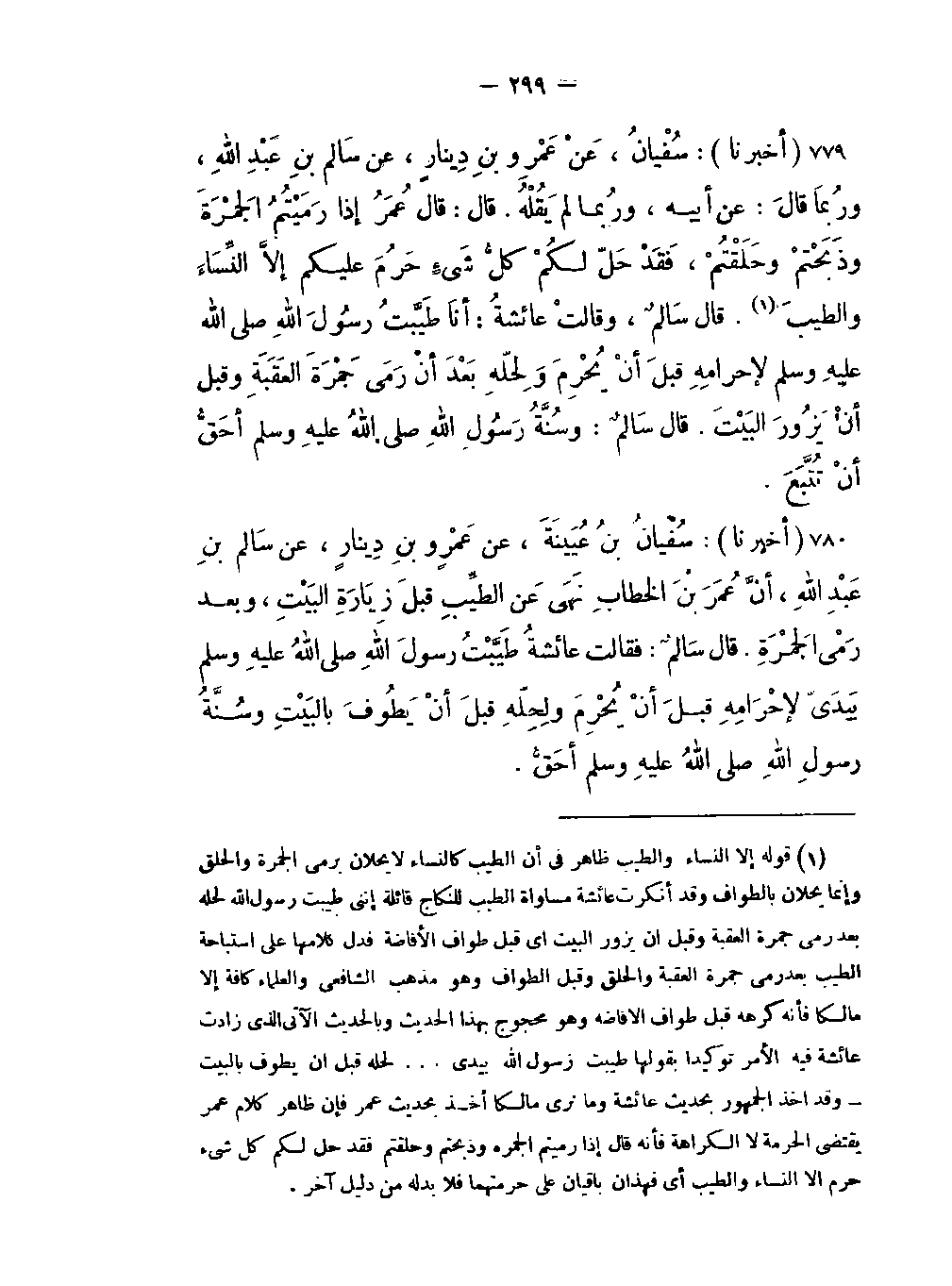 -أنَّ عُمَرَ بْنَ الخطابِ نَهَى عَن الطِّيبِ قبلَ زِيارَةِ البَيْتِ وبعد رَمْيَ الجَمْرَةِ قال سَالمٌ: فقالت عائشةُ طَيَّبتُ رسُولَ اللَّه صلى اللَّه عليه وسلم بيَدَيَ لإحرامِهِ قبل أنْ يُحْرِمَ وَلِحِلّهِ قبل أنْ يطُوفَ بالبَيْتِ وسُنَّةُ رَسُولِ اللَّهِ صلى اللَّهُ عليه وسلم أحَقُّ.