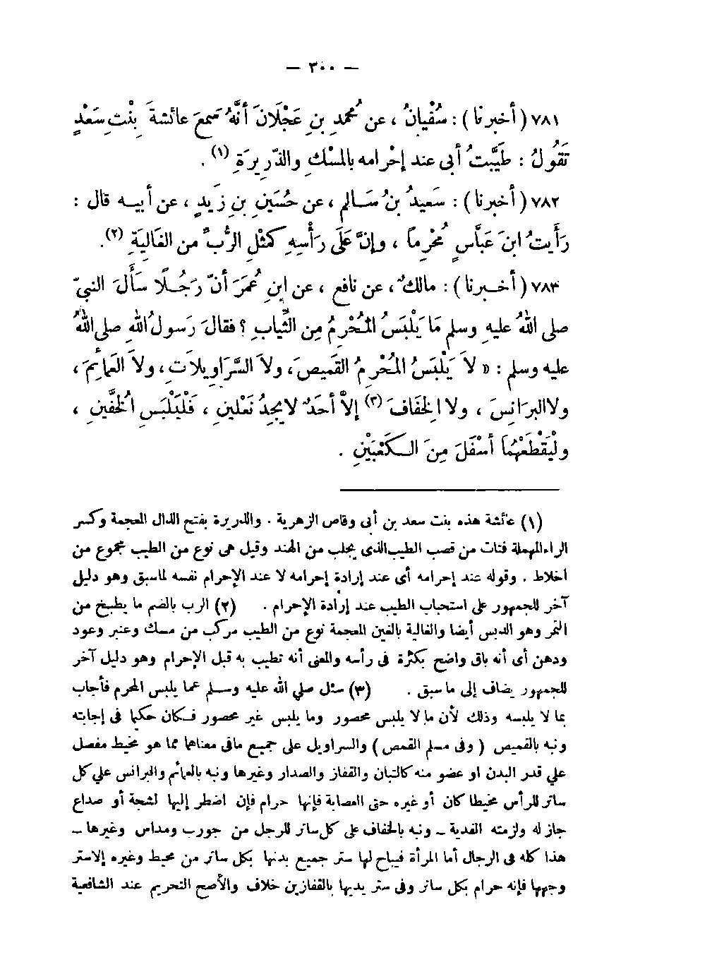 -أنَّ رَجُلاً سَألَ النبيّ صلى اللَّه عليه وسلم مَا يَلْبَسُ المُحْرِمُ مِن الثِّيابِ؟ فقالَ رسُولَ اللَّه صلى اللَّه عليه وسلم: "لاَ يَلْبَسُ المَحْرِمُ القَميصَ ولاَ السَّرَاوِيلاَتِ ولاَ العَمائِمَ ولا البَرَانِسَ ولا الخِفَافَ (سئل صلى اللَّه عليه وسلم عما يلبس المحرم فأجاب بمالا يلبسه وذلك لأن ما لا يلبس محصور وما يلبس غير محصور فكان حكيما في إجابته ونبه بالقميص (وفي مسلم القمص) والسراويل على جميع ما في معناهما مما هو مخيط مفصل على قدر البدن أو عضو منه كالتبان والقفاز والصدار وغيرها ونبه بالعمائم والبرانس على كل ساتر للرأس مخيطا كان أو غيره حتى العصابة فإنها حرام فإن اضطر إليها لشجة أو صداع جاز له ولزمته الفدية ونبه بالخفاف على كل ساتر للرجل من جورب ومداس وغيرهاهذا كله في الرجال أما المرأة فيباح لها ستر جميع بدنها بكل ساتر من محيط وغيره إلا ستر وجهها فإنه حرام بكل ساتر وفي ستر يديها بالقفازين خلاف والأصح التحريم عند الشافعية والحكمة في تحريم اللباس المذكور على المحرم ووجوب لبسه الإزار والرداء إبعاده عن الترفه واتصافه بصفات الذليل المنكسر الناسي لذاته المقبل على طاعاته وتذكر الكفن وحالة الموت والبعث وبذلك يكون أقرب إلى تذكر اللَّه وأقوى في مراقبته وصيانة عبادته وقوله إلا أحد لا يجد نعلين فليلبس الخفين وليقطعهما إلخ النعل ما لا يستر الرجل بل يقيها حرارة الأرض وبردها وما بها من شوك أو زجاج ونحوه وفي هذا الحديث والحديثين بعد وليقطعهما أسفل الكعبين وفيما يليهما لا توجد هذه العبارة بل اقتصر على لبس الخفين ولم يذكر قطعهما إلى أسفل الكعبين وكان ذلك سببا في اختلاف العلماء فقال أحمد يجوز لبس الخفين بحالهما ولا يجب قطعهما لحديث ابن عباس وحديث سالم عن أبيه الآتي بعد حديث ابن عباس وزعم أصحاب أحمد أن حديث ابن عمر المصرح بقطعهما منسوخ وقالوا أن قطعهما تبديد للأموال وهو منهي عنه وقال مالك والشافعي وأبو حنيفة وجمهور العلماء لا يجوز لبسهما إلا بعد قطعهما أسفل من الكعبين لحديث ابن عمر وأما حديث ابن عباس فيجب حمله على حديث ابن عمر لأن المطلق يحمل على المقيد والزيادة مقبولة من الثقة وليس هذا بإضاعة للمال لأن الشرع قد ورد بها فيجب الإذعان له فإن لبس الخفين لعدم النعلين فلا فدية عليه لأنه لو كان عليه فدية لبينها النبي وقال أبو حنيفة وأصحابه عليه الفدية كما إذا إحتاج إلى حلق رأسه فحلقه وإن لبس ما نهي عنه عامدا لزمته الفدية بالإجماع فإن كان ناسيا فلا فدية عليه عند الشافعي وأحمد وأوجبها أبو حنيفة ومالك) إلاَّ أحَدٌ لا يَجِدُ نَعْلَيْنِ فَلْيَلْبَسِ الخُفَّينِ ولْيَقْطَعْهُماَ أسْفَلَ مِنَ الكَعْبَيْنِ.