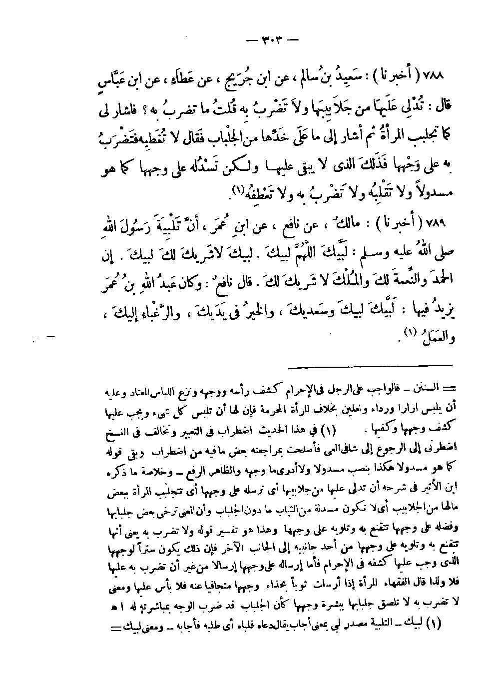 -تَدْلِي عَلَيهَا من جَلاَبِيبِهَا ولاَ تَضْرِبُ بِه قُلتُ ما تضربُ به: فأشار لي كما تجلب المرأةُ ثم أشار إلى ما على خَدِّها من الجلْباب فَقال لا تُغَطِيه فَتَضْرَبُ به على وَجْهها فَذَلكَ الذي لا يبقى عليها ولكن تَسْدُله على وجهها كما هو مسدولاً ولا تَقْلِبُه ولا تَضْرَبُ به ولا تَعْطِفُه (في هذا الحديث اضطراب في التعبير وتخالف في النسخ اضطرني إلى الرجوع إلى؟؟ فأصلحت بمراجعته بعض ما فيه من اضطراب وبقي قوله كما هو مسدولا هكذا بنصب مسدولا ولا أدري ما وجهه والظاهر الرفع وخلاصة ماذكره ابن الأثير في شرحه أن تدلي عليها من جلابيبها أي ترسله على وجهها أي تتجلبب المرأة ببعض مالها من الجلابيب أي لا تكون مسدلة من الثياب ما دون الجلباب وأن المعنى ترخي بعض جلبابها وفضله على وجهها تتقنع به وتلويه على وجهها وهذاهو تفسير قوله ولا تضرب به يعني أنها تتقنع به وتلويه على وجهها من أحد جانبيه إلى الجانب الآخر فإن ذلك يكون ستراً لوجهها الذي وجب عليها كشفه في الإحرام فأما إرساله على وجهها إرسالاً من غير أن تضرب به عليها فلا ولذا قال الفقهاء المرأة إذا أرسلت ثوبا بحذاء وجهها متجافيا عنه فلا بأس عليها ومعنى لا تضرب به لا تلصق جلبابها ببشرة وجهها كأن الجلباب قد ضرب الوجه بمباشرته له اهـ) .