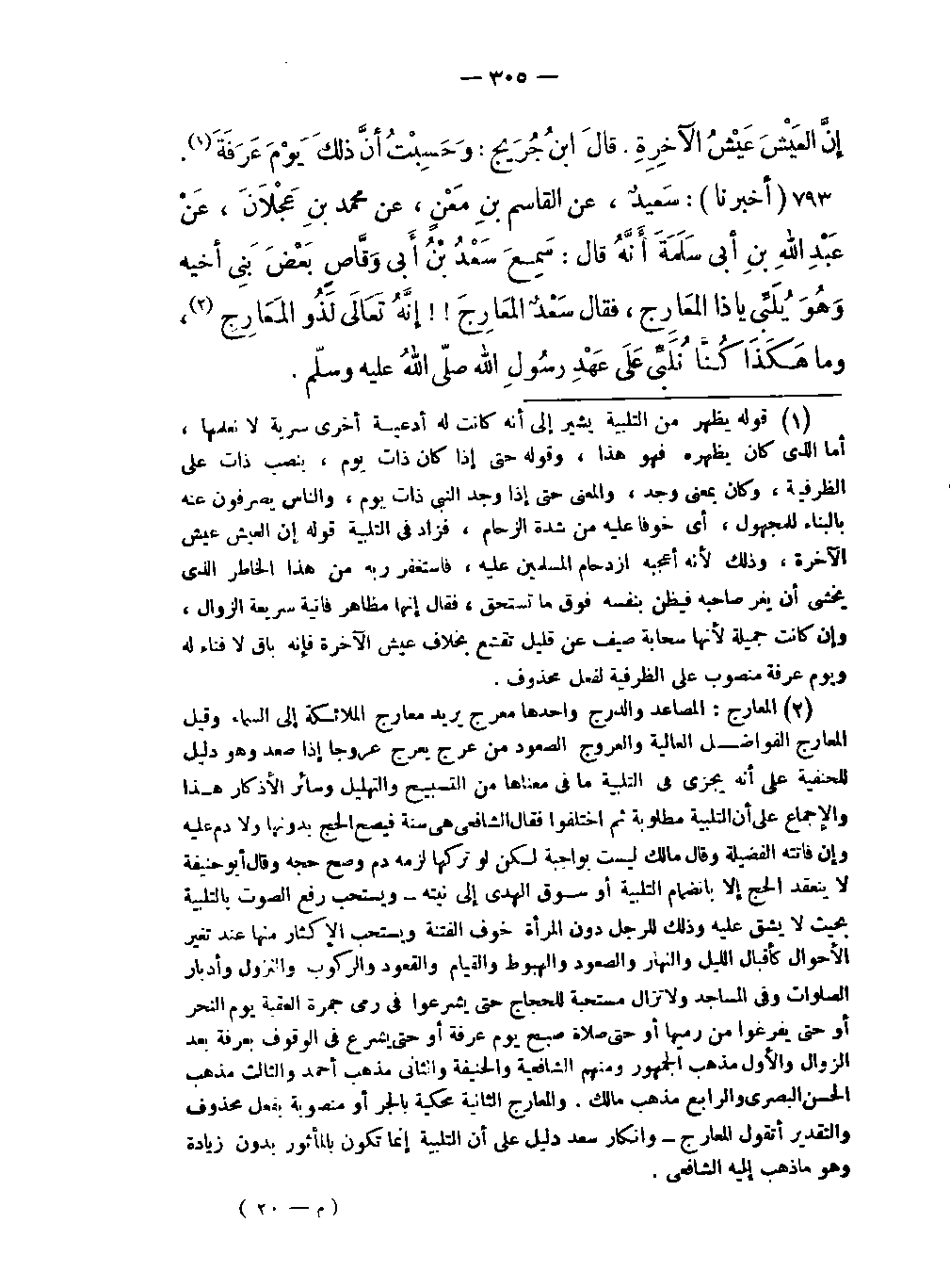-سَمِعَ سَعْدُ بْنُ أبي وَقَّاصٍ بَعْضَ بَني أخيه وَهُوَ يُلَبِّي ياذا المعارِج فقال سَعْدٌ المعارِجَ! ! إنَّهُ تَعَالَى لَذُو المَعَارِج (المعارج: المصاعد والدرج أحدها معرج يريد معارج الملائكة إلى السماء وقيل المعارج الفواضل العالية والعروج الصعود من عرج يعرج عروجا إذا صعد وهو دليل للحنفية على أنه يجزي في التلبية ما في معناها من التسبيح والتهليل وسائر الأذكار هذا والإجماع على أن التلبية مطلوبة ثم اختلفوا فقال الشافعي هي سنة فيصح الحج بدونها ولا دم عليه وإن فاتته الفضيلة وقال مالك ليست بواجبة لكن لو تركها لزمه دم وصح حجه وقال أبو حنيفة لا ينعقد الحج إلا بإنضمام التلبية أو سوق الهدى إلى نيته ويستحب رفع الصوت بالتلبية بحيث لا يشق عليه وذلك للرجل دون المرأة خوف الفتنة ويستحب الإكثار منها عند تغير الأحوال كإقبال الليل والنهار والصعود والهبوط والقيام والقعود والركوب والنزول وإدبار الصلوات وفي المساجد ولا تزال مستحبة للحجاج حتى يشرعوا في رمي جمرة العقبة يوم النحر أو حتى يفرغوا من رميها أو حتى صلاة صبح يوم عرفة أو حتى يشرعوا في الوقوف بعرفة بعد الزوال والأول مذهب الجمهور ومنهم الشافعية والحنفية والثاني مذهب أحمد والثالث مذهب الحسن البصري والرابع مذهب مالك والمعارج الثانية محكية بالجر أو منصوبة بفعل محذوف والتقدير أتقول المعارج وإنكار سعد دليل على أن التلبية إنما تكون بالمأثور بدون زيادة وهو ما ذهب إليه الشافعي) وما هَكَذَا كُنَّا نُلَبيِّ عَلَى عَهْدِ رَسُولِ اللَّهِ صلى اللَّه عليه وسلّم.