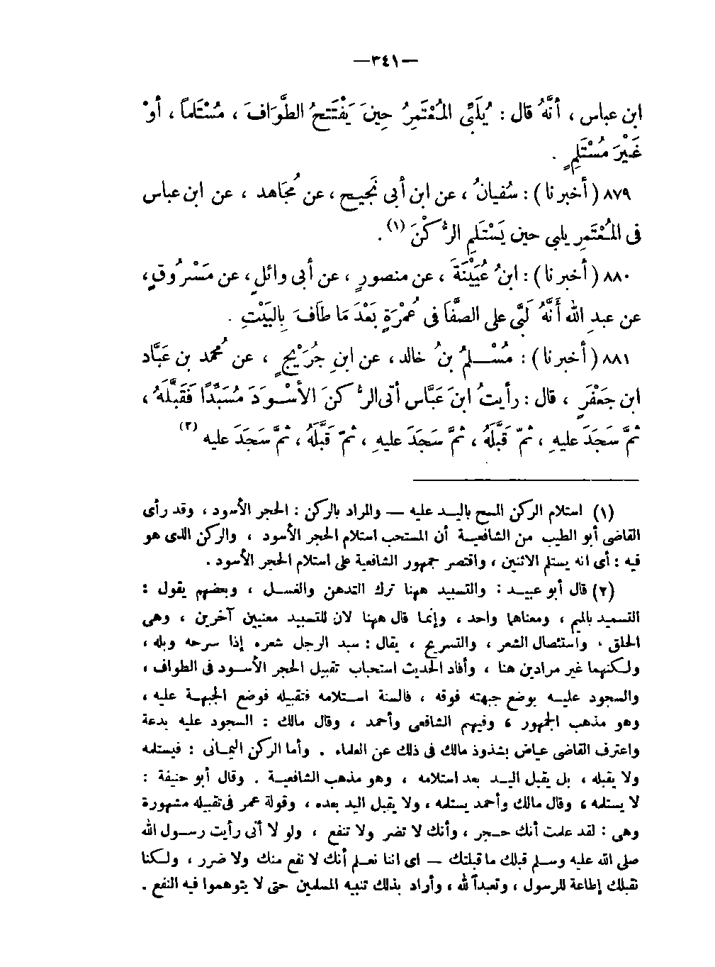 -رأيتُ ابنَ عَبَّاس أتى الرُّكنَ الأسْودَ مُسَبِّداً فَقَبَّلَهُ، ثمَّ سَجَدَ عليهِ، ثمَّ قَبَّلَهُ، ثمَّ سَجَدَ عليهِ، ثمَّ قَبَّلَهُ، ثمَّ سَجَدَ عليهِ -[342]- (قال أبو عبيد: والتسبيد ههنا ترك التدهن والغسل وبعضهم يقول: التسميد بالميم ومعناهما واحد وإنما قال ههنا لأن للتسبيد معنيين آخريين وهي الحلق واستئصال الشعر والتسريح يقال: سبد الرجل شعره إذا سرحه وبله ولكنهما غير مرادين هنا وأفاد الحديث استحباب تقبيل الحجر الأسود في الطواف والسجود عليه بوضع جبهته فوقه فالسنة استلامه فتقبيله فوضع الجبهة عليه وهو مذهب الجمهور وفيهم الشافعي وأحمد وقال مالك: السجود عليه بدعة واعترف القاضي عياض بشذوذ مالك في ذلك عن العلماء وأما الركن اليماني: فيستلمه ولا يقبله بل يقبل اليد بعد استلامه وهو مذهب الشافعية وقال أبو حنيفة: لا يستلمه وقال مالك وأحمد يستلمه ولا يقبل اليد بعده وقولة عمر في تقبيله مشهورة وهي: لقد علمت أنك حجر وأنك لا تضر ولا تنفع ولولا أني رأيت رسول اللَّه صلى اللَّه عليه وسلم قبلك ما قبلتك أي أننا نعلم أنك لا نفع منك ولاضرر ولكنا نقبلك إطاعة للرسول وتعبداً لله وأراد بذلك تنبيه المسلمين حتى لا يتوهموا فيه النفع) .