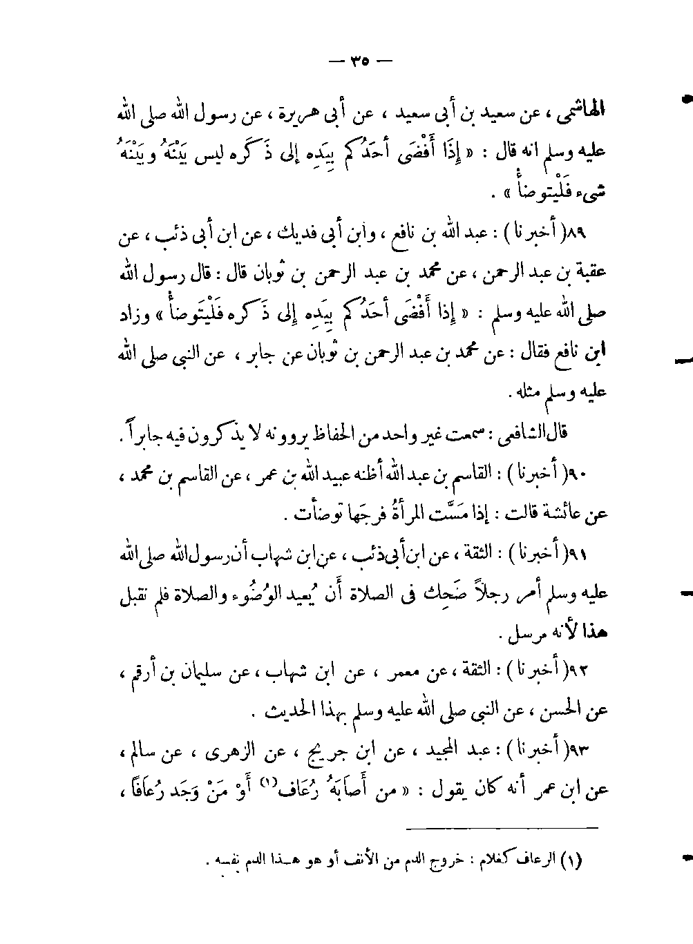 89- (أخبرنا) : عبد اللَّه بن نافع، وابن أبي فديك، عن ابن أبي ذئب، عن عقبة بن عبد الرحمن، عن محمد بن عبد الرحمن بن ثوبان قال: -قال رسول اللَّه صلى اللَّه عليه وسلم: «إِذا أَفْضى أحَدُكم بِيَدِه إلى ذكَره فَلْيَتَوضأ» وزاد ابن نافع فقال: عن محمد بن عبد الرحمن بن ثوبان عن جابر، عن النبي صلى الله عليه وسلم مثله.