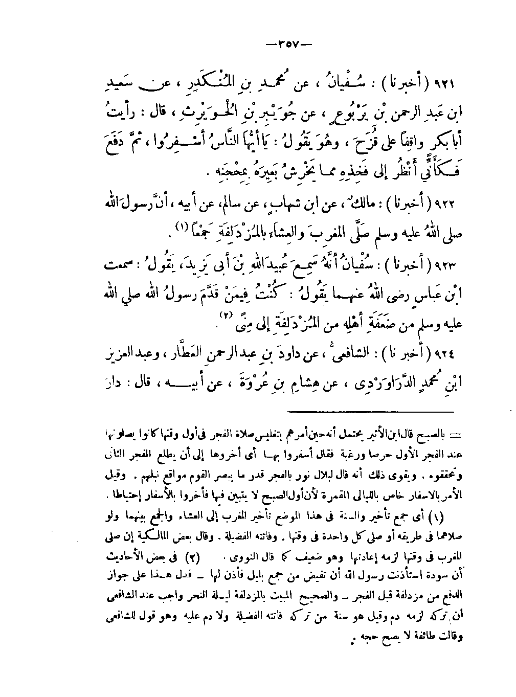 -أنَّ رَسُولَ اللَّهِ صلى اللَّهُ عليه وسلّم صَلَّى المغرِبَ والعِشَاءَ بالمُزْدَلِفَةَ جَمْعاً (أي جمع تأخير والسنة في هذا الموضع تأخير المغرب إلى العشاء والجمع بينهما ولو صلاهما في طريقه أو صلى كل واحدة في وقتها وفاتته الفضيلة وقال بعض المالكية إن صلى المغرب في وقتها لزمه إعادتها وهو ضعيف كما قال النووي) .