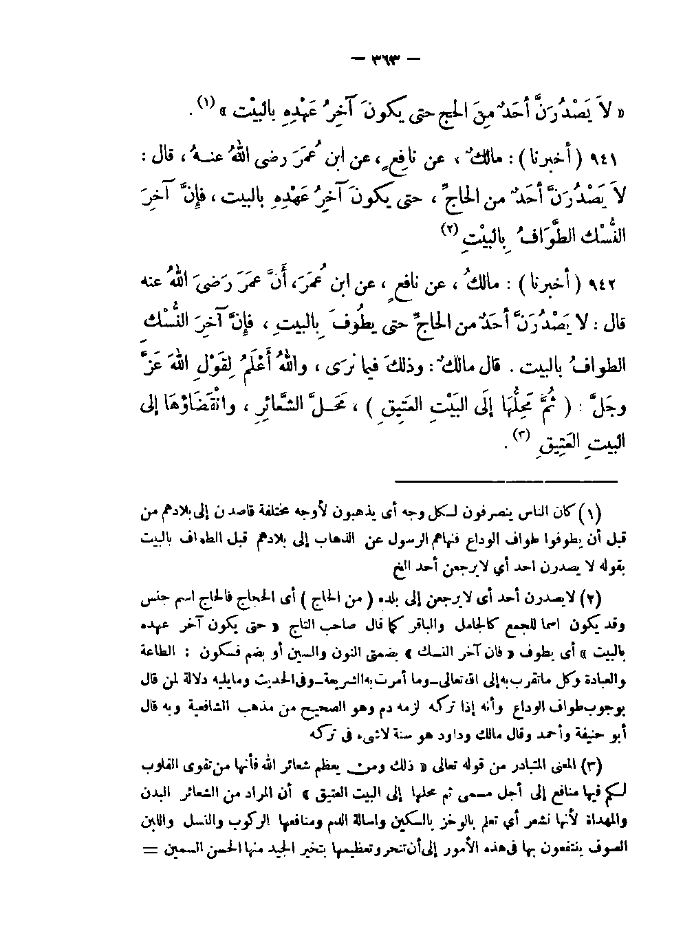 - "لاَ يَصْدُرَنَّ أحَدٌ من الحاجِّ، حتى يطُوفَ بِالبَيْت، فإنَّ آخِرَ النُّسْك الطَّوَافُ بِالبَيْتِ قال مالكٌ: وذلكَ فيما نرَى، واللَّهُ أَعْلَمُ لِقَوْلِ اللَّهِ عَزَّوَجَلَّ: (ثُمَّ مَحِلُّهَا إلَى البَيْت العَتِيقِ) ، مَحَلَّ الشَّعائِرِ، وانْقِضَاؤهَا إلى البَيْت العَتِيق -[364]- (المعنى المتبادر من قوله تعالى «ذلك ومن يعظم شعائر اللَّه فإنها من تقوى القلوب لكم قيها منافع إلى أجل مسمى ثم محلها إلى البيت العتيق» إن المراد من الشعائر البدن والمهداة لأنها تشعر أي تعلم بالوخز بالسكين وإسالة الدم ومنافعها الركوب والنسل واللبن والصوف ينتفعون بها في هذه الأمور إلى أن تنحر وتعظيمها بتخير الجيد منها الحسن السمين الغالي الثمن فإن تعظيمها من أفعال ذي تقوى القلوب ثم هي وقت نحرها منتهية إلى البيت أي ما يليه من الحرم وقد رجح هذا الوجه البيضاوي وغيره قال وهو أوفق لظاهرما بعده وقيل المراد من الشعائر مواضع الحج لكم في تلك المواضع منافع بالأجر بأداء ما يلزم أداؤه فيها إلى أجل مسمى وهو القضاء أيام الحج ثم محلها أي محل الناس من إحرامهم إلى البيت العتيق أي منته إليه بأن يطوفوا به طواف الزيارة يوم النحر وروى نحو ذلك عن مالك الموطأ اهـ من البيضاوي والألوسي) .
