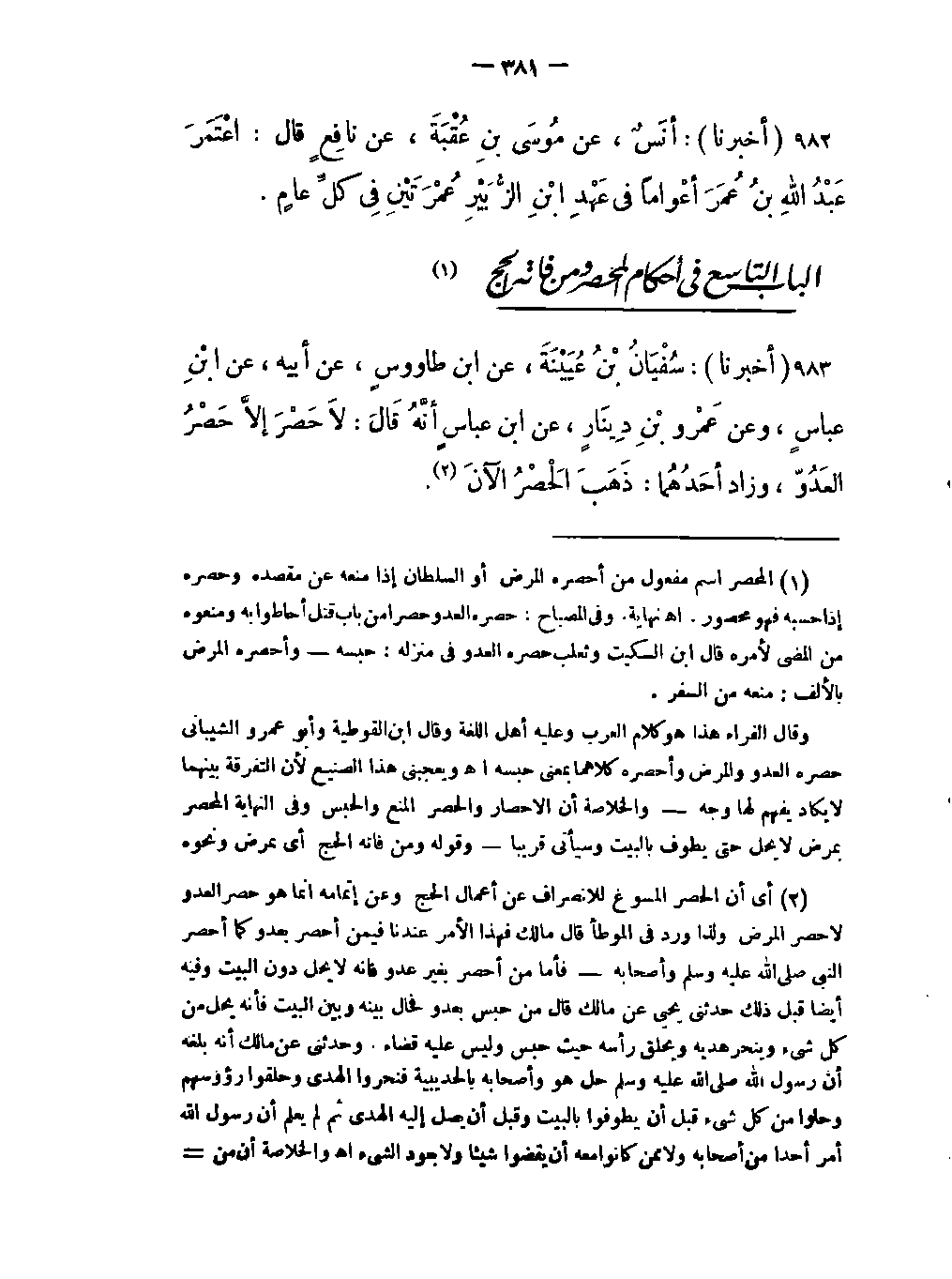 -لاَ حَصْرَ إلاَّ حَصْرُ العَدوّ، وزاد أحَدُهُما: ذَهَبَ الْحَصْرُ الآنَ -[382]- (أي أن الحصر المسوغ للإنصراف عن أعمال الحج وعن إتمامه إنما هو حصر العدو لا حصر المرض ولذا ورد في الموطأ قال مالك فهذا الأمر عندنا فيمن أحصر بعدو كما أحصر النبي صلى الَّله عليه وسلم وأصحابه فأما من أحصر بغيرعدو فإنه لا يحل دون البيت وفيه أيضا قبل ذلك يحي عن مالك قال من حبس بعدو فحال بينه وبين البيت فإنه يحل من كل شئ وينحر هديه ويحلق رأسه حيث حبس وليس عليه قضاء وحدثني عن مالك أنه بلغه أن رسول اللَّه صلى الَّله عليه وسلم حل هو وأصحابه بالحديبية فنحروا الهدي وحلقوا رؤوسهم وحلوا من كل شئ قبل أن يطوفوا بالبيت وقبل أن يصل إليه الهدي ثم لم يعلم أن رسول اللَّه صلى الَّله عليه وسلم أمر أحدا من أصحابه ولا ممن كانوا معه أن يقضوا شيئا ولا بعود الشيء اهـ والخلاصة أن من أحصر بعدو تحلل من الحج من غير طواف ومن أحصر بمرض فلا يتحلل حتى يطوف فهذا معنى قوله لا حصر إلا حصر العدو أي لا حصريسوغ ترك الطواف بالبيت والسعي بين الصفا والمروة إلا حصر العدو فأما الحصر بالمرض فلا بد فيه من الطواف والسعي كما في حديث سالم عن أبيه الآتي قريبا وأما قوله ذهب الحصر الآن فمعناه: أن الإسلام قد قوي وذهب أعداؤه وذهبت دولهم فلا يتصور حصر العدو بعد ذلك) .