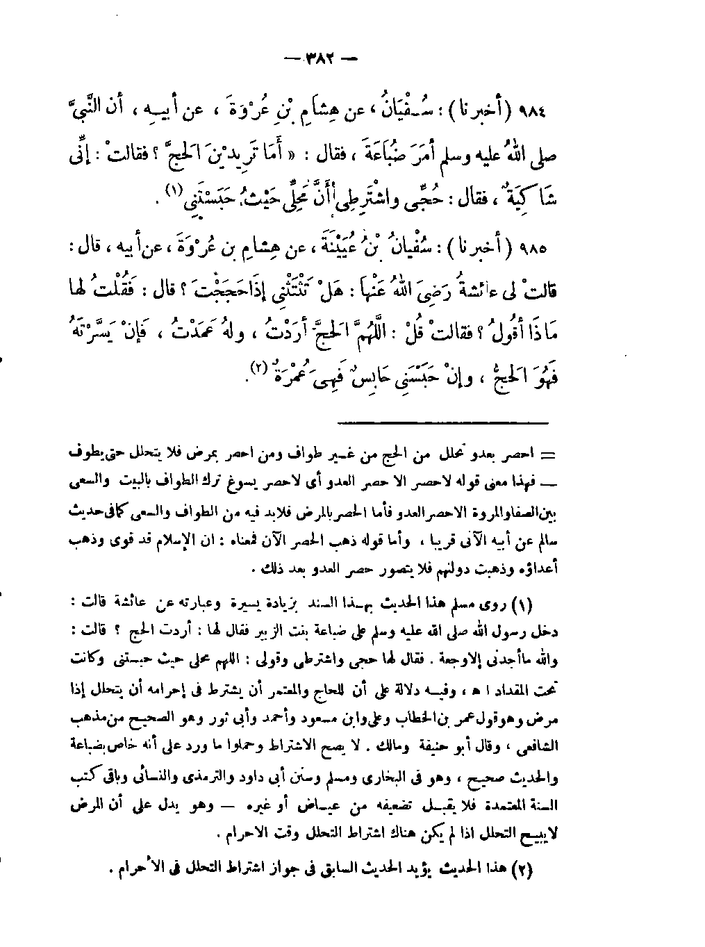 -أنَّ النَّبيَّ صلى الَّله عليه وسلم أمَرَ ضُبَاعَةَ، فقال: "أَمَا تَرِيدينَ الحَجَّ؟ فقالتْ: إنِّي شَاكِيةٌ، فقال: حُجِّي واشْتَرِطِي أَنَّ مَحِلِّي حَيْثُ حَبَسْتَنِي (روى مسلم هذا الحديث بهذا السند بزيادة يسيرة وعبارته عن عائشة قالت: دخل رسول اللَّه صلى الَّله عليه وسلم على ضباعة بنت الزبير فقال لها: أردت الحج؟ قالت: واللَّه ما أجدني إلا وجعة فقال لها حجي واشترطي وقولي: اللهم محلي حيث حبستني وكانت تحت المقداد اهـ وفيه دلالة على أن للحاج والمعتمر أن يشترط في إحرامه أن يتحلل إذا مرض وهو قول عمر بن الخطاب وعلي وابن مسعود وأحمد وأبي ثور وهو الصحيح من مذهب الشافعي وقال أبو حنيفة ومالك لا يصح الإشتراط وحملوا ما ورد على أنه خاص بضباعة والحديث صحيح وهو في البخاري ومسلم وسنن أبي داود والترمذي والنسائي وباقي كتب السنة المعتمدة فلا يقبل تضعيفه من عياض أو غيره وهو يدل على أن المرض لا يبيح التحلل إذا لم يكن هناك إشتراط التحلل وقت الإحرام) .