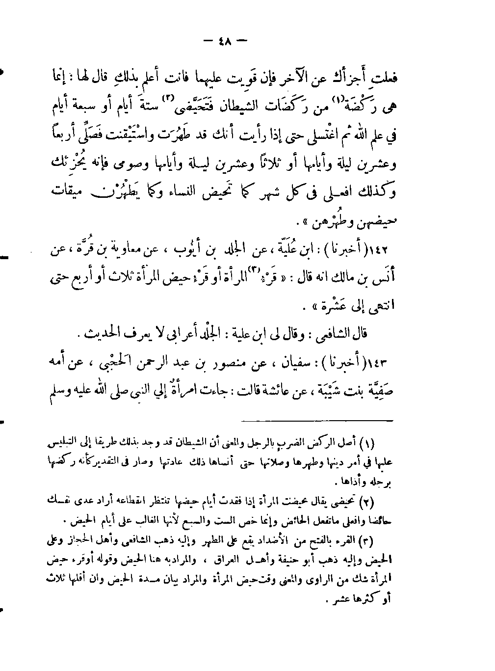 - «قَرْءُ (بالفتح من الأضداد يقع على الطهر وإليه ذهب الشافعي وأهل الحجاز وعلى الحيض وإليه ذهب أبو حنيفة وأهل العراق، والمراد به هنا الحيض وقوله أو قرء حيض المرأة شك من الراوي والمعنى وقت حيض المرأة والمراد بيان مدة الحيض وإن أفلها ثلاث أو كثرها عشر) المرأة أو قَرْءُ حيض المرأة ثلاث أو أربع حتى انتهى إلى عَشْرَة» .