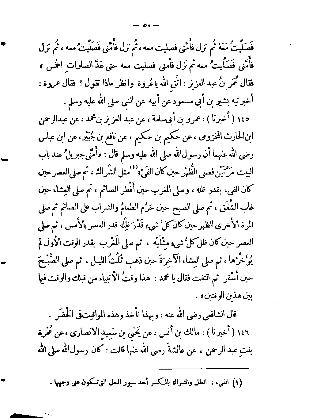 -أن رسول اللَّه صلى اللَّه عليه وسلم قال: " أمَّني جبريلُ عند باب البيت مَرَّتَين فصلى الظُهْر حين كان الفَئُ (الظل والشراك بالكسر أحد سيور النعل التي تكون على وجهها) مثل الشِّراك، ثم صلى العصر حين كان الفيء بقدر ظله، وصلى المغرب حين أفطر الصائم، ثم صلى العِشاء حين غاب الشَّفَق، ثم صلى الصبح حين حَرُم الطعامُ والشراب على الصائم ثم صلى المرة الأخرى الظهر حين كان كلُّ شئٍ قَدْرَ ظِلِّه قدر العصر بالأمس، ثم صلى العصر حين كان ظل كلُّ شئٍ مِثْلَيْه، ثم صلى الْمَغرب بقدر الوقت الأول لم يُؤَخِرْها، ثم صلى العشاء الآخِرَةَ حين ذهب ثُلُثُ الليل، ثم صلى الصُّبْحَ حين أَسْفَر ثم التفت فقال يا محمد: هذا وقت الأنبياء من قبلك والوقت فيما بين هذين الوقتين".