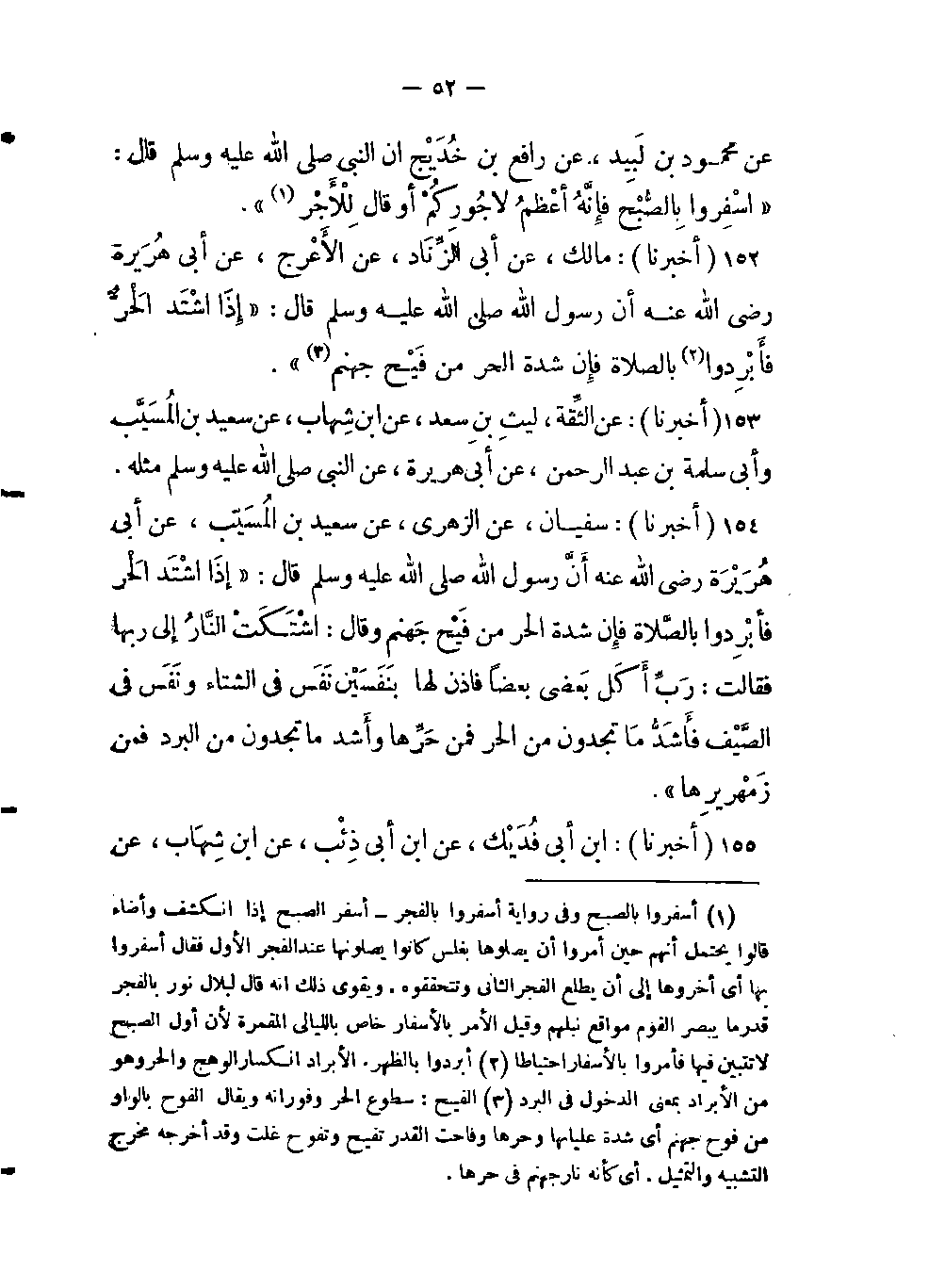 -أنَّ رسول اللَّه صلى اللَّه عليه وسلم قال: "إِذا اشْتَد الحَر فأَبْرِدوا بالصّلاة فإن شدة الحر من فَيْح جَهنم وقال: اشْتَكَتْ النَّارُ إلى ربها فقالت: رَبِّ أَكلَ بَعضي بعضاً فاذن لها بنَفَسَيْن نَفَس في الشتاء ونَفَس في الصَّيْف فأَشَدُّ مَا تجدون من الحر فمن حَرِّها وأَشد ما تجدون من البرد فمن زَمْهَريرِها".
