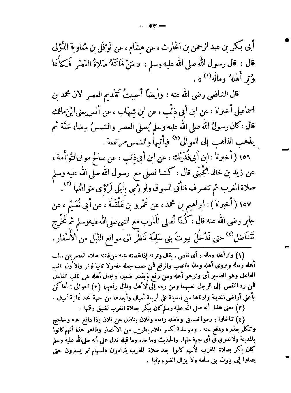 -كنا نصلي المَغْرب مع النبي صلى اللَّه عليه وسلم ثم نخرج نتناضل (تناضلوا: رموا للسق وناضله راماه وفلان يناضل عن فلان إذا دافع عنه وحاجج وتتكلم بعذره ودفع عنه وبنو سلمة بكسر اللام بطن من الانصار وظاهر هذا أنهم كانوا بالمدينة ولا ندري في أي جهة منها والحديث وما بعده وما قبله تدل على أنه صلى اللَّه عليه وسلم كان يبكر بصلاة المغرب لأنهم كانوا بعد صلاة المغرب يترامون بالسهام ثم يسيرون حتى يصلوا إلى بيوت بني سلمة ولا يزال الضوء باقيا) حتى نَدْ خُلَ بيوت بني سَلِمَة نَنْظُر الى مواقع النَّبْل من الإسفار.