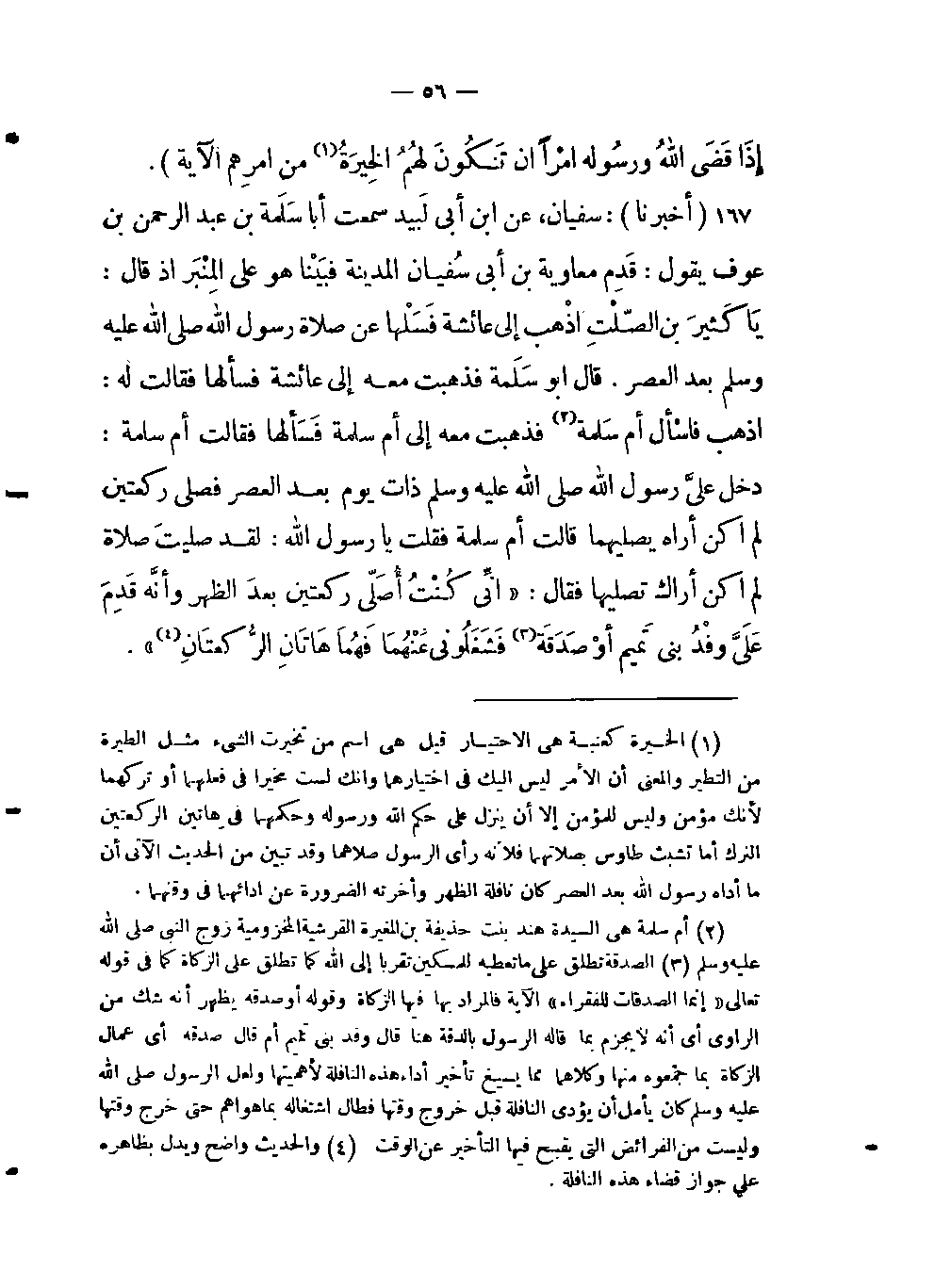 -قَدِم معاوية بن أبي سفيان المدينة فبَيْنا هو على المِنْبَر إذ قال: يَا كَثِيرَ بن الصّلْتِ اذْهب إلى عائشة فَسَلْها عن صلاة رسول اللَّه صلى اللَّه عليه وسلم بعد العصر قال ابو سَلَمة فذهبت معه إلى عائشة فسألها فقالت له: اذهب فسأل ام سَلَمة (أم سلمة هي السيدة هند بنت حذيفة بن المغيرة القرشية المخزومية زوج النبي صلى اللَّه عليه وسلم) فذهبت معه إلى أم سلمة فَسَألها فقالت أم سلمة: دخل عليَّ رسول اللَّه صلى اللَّه عليه وسلم ذات يوم بعد العصر فصلى ركعتين لم أكن أراه يصليهما قالت أم سلمة فقلت يا رسول اللَّه: لقد صليتَ صلاة لم أكن أراك تصليها فقال: «انِّي كُنْتُ أُصَلّي ركعتين بعدَ الظهر وأنَّه قَدِمَ عَلَيَّ وفْدُ بني تَميم أو صَدَقة (الصدقة تطلق على ما تعطيه للمسكين تقرباً إلى اللَّه كما تطلق على الزكاة كما في قوله تعالى» إنما الصدقات للفقراء" الآية فالمراد بها فيها الزكاة وقوله أو صدقة يظهر أنه شك من الراوي أي أنه لا يجزم بما قاله الرسول بالدقة هنا قال وفد بني تميم أم قال صدقة أي عمال الزكاة بما جمعوه منها وكلاهما مما يسبغ تأخير أداء هذه النافلة لأهميتها ولعل الرسول صلى اللَّه عليه وسلم كان يأمل أن يؤدي النافلة قبل خروج وقتها فطال اشتغاله بما هو اهم حتى خرج وقتها وليست من الفرائض التي يقبح فيها التأخير عن الوقت) فَشَغَلُوني عَنْهُما فَهُمَا هَاتَانِ الرُّكعتَانِ -[57]- (والحديث واضح يدل بظاهره على جواز قضاء هذه النافلة) .