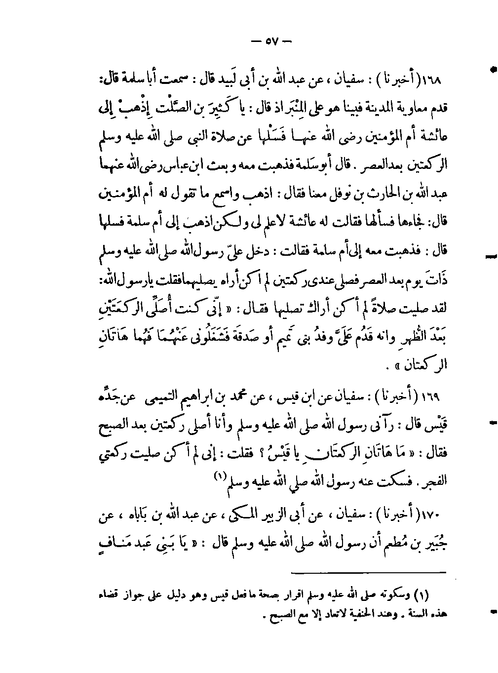 -سمعت أبا سَلَمة قال: قَدِم معاوية المدينة فبَيْنا هو على المِنْبَر إذ قال: يَا كَثِيرَ بن الصّلْتِ اذْهب إلى عائشة أم المؤمنين رضي الله عنها فَسَلْها عن صلاة رسول اللَّه صلى اللَّه عليه وسلم بعد العصر قال أبو سَلَمة فذهبت معه وبعث ابن عباس رضي الله عنهما عبد الله بن الحارث بن نوفل معنا فقال: اذهب واسمع ما تقوله أم المؤمنين قال: فجاءها فسألها فقالت له عائشة لا علم لي ولكن اذهب إلى أم سلمة فسلها قال: فذهبت معه إلى أم سلمة فقالت: دخل عليّ رسول اللَّه صلى اللَّه عليه وسلم ذَاتَ يوم بعد العصر فصلى عندي ركعتين لم أكن أراه يصليهما فقلت يا رسول اللَّه: لقد صليتَ صلاةً لم أكن أراك تصليها فقال: " انِّي كُنْتُ أُصَلّي ركعتين بعدَ الظهر وأنَّه قَدِمَ عَلَيَّ وفْدُ بني تَميم أو صَدَقة فَشَغَلُوني عَنْهُما فَهُمَا هَاتَانِ الرُّكعتَانِ.