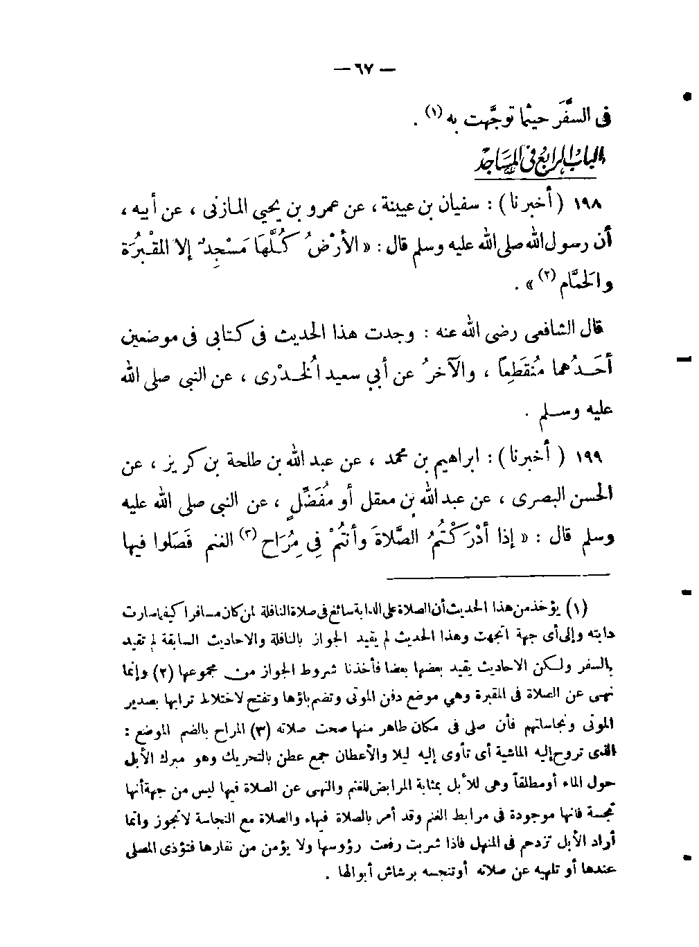 -أن رسول اللَّه صلى اللَّه عليه وسلم قال: "الارْضُ كُلَّهَا مِسْجِدٌ إلا المقْبرَةُ والحَمَّام (وإنما نهى عن الصلاة في المقبرة وهي موضع دفن الموتى وتضم باؤها وتفتح لاختلاط ترابها بصدير الموتى ونجاساتهم فأن صلى في مكان طاهر منها صحت صلاته) .
