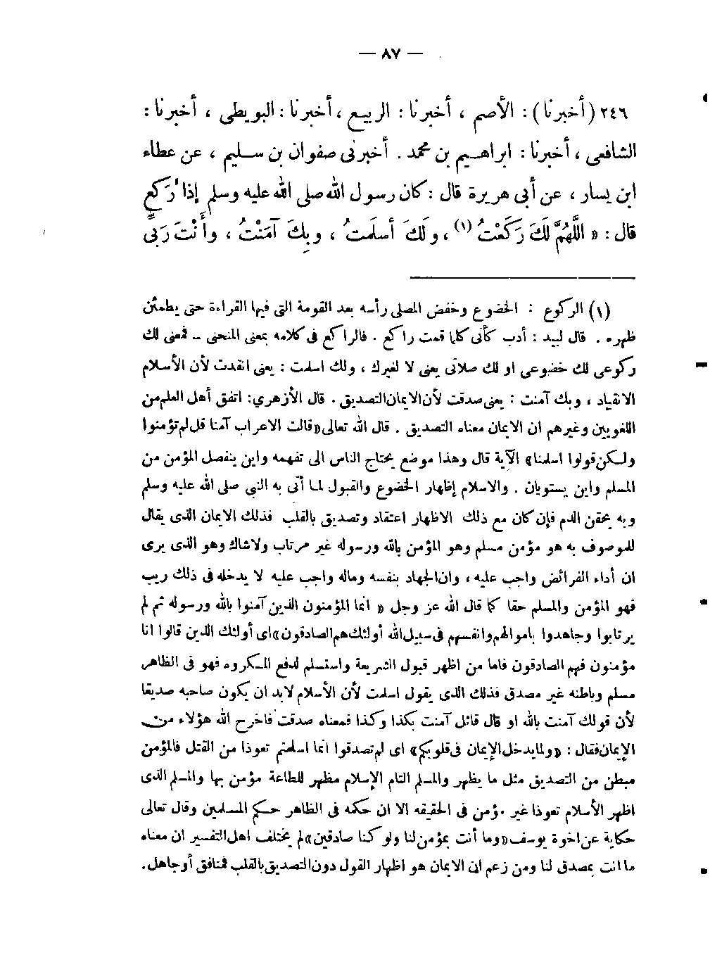 -كان رسولُ اللَّه صلى اللَّه عليه وسَلم إذا رَكع قال: "اللَّهُمَّ لَكَ رَكَعْتُ (الركوع: الخضوع وخفض المصلي رأسه بعد القومة التي فيها القراءة حتى يطمئن ظهره. قال لبيد: أدب كأني كلما قمت راكع. فالراكع في كلامه بمعنى المنحني - فمعنى ذلك ركوعي لك خضوعي أو لك خضوعي أو لك صلاتي يعني لا لغيرك، ولك أسلمت: يعني انقدت لأن الإسلام الإنقياد، وبك آمنت: يعني صدقت لأن الإيمان التصديق. قال الأزهري: اتفق أهل العلم من اللغويين وغيرهم أن الإيمان معناه التصديق. قال اللَّه تعالى «قالت الأعراب آمنا قل لم تؤمنوا ولكن قولوا أسلمنا» الآية قال وهذا موضع يحتاج