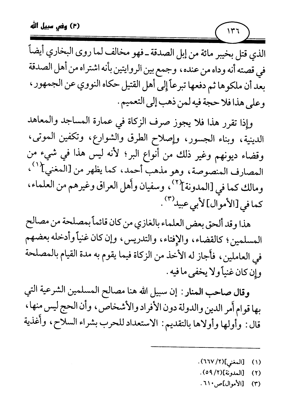وقال صاحب المنار: إن سبيل الله هنا مصالح المسلمين الشرعية التي بها قوام أمر الدين والدولة دون الأفراد والأشخاص، وأن الحج ليس منها، قال: وأولها وأولاها بالتقديم: الاستعداد للحرب بشراء السلاح، وأغذية
