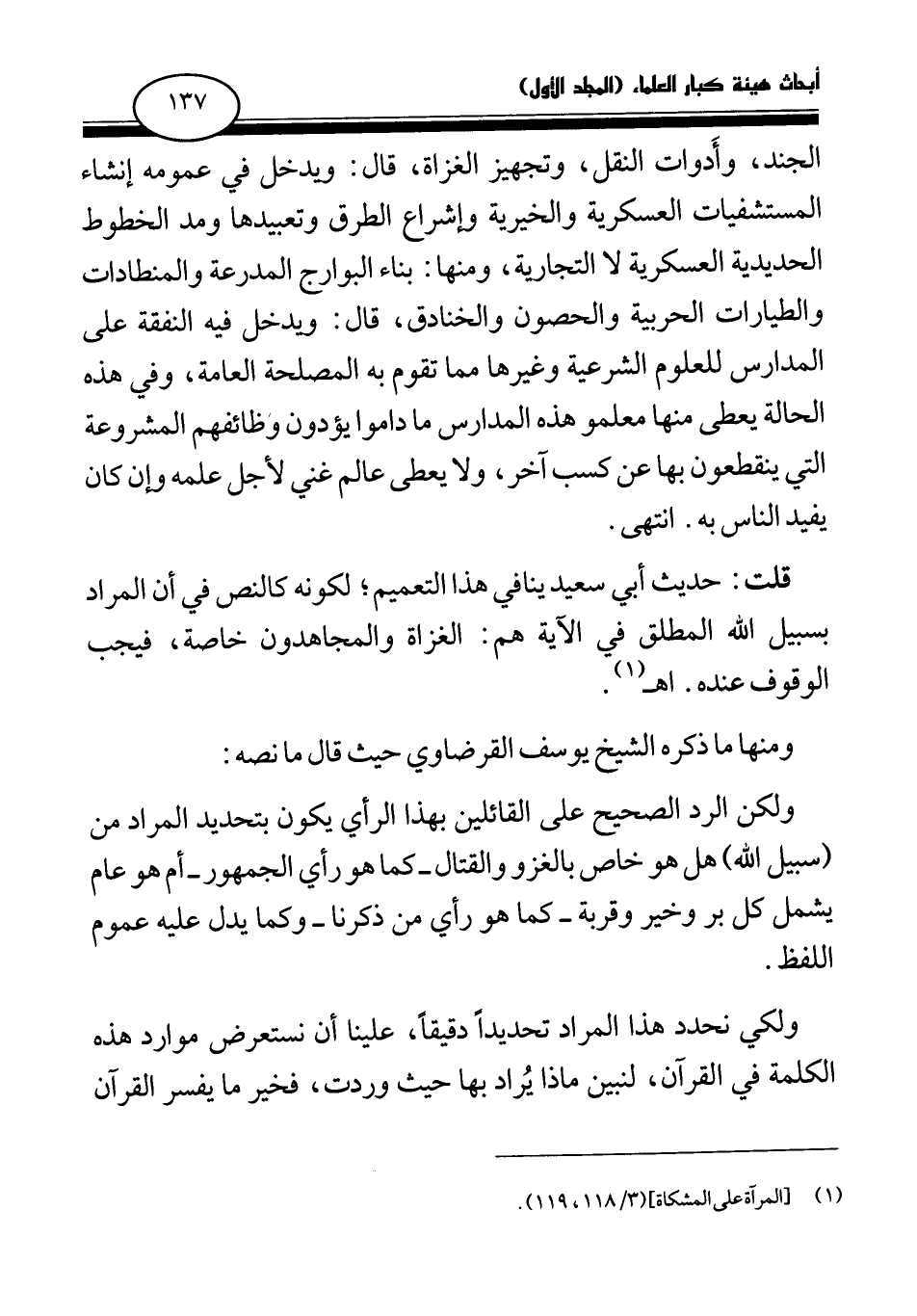 الجند، وأدوات النقل، وتجهيز الغزاة، قال: ويدخل في عمومه إنشاء المستشفيات العسكرية والخيرية وإشراع الطرق وتعبيدها ومد الخطوط الحديدية العسكرية لا التجارية، ومنها: بناء البوارج المدرعة والمنطادات والطيارات الحربية والحصون والخنادق، قال: ويدخل فيه النفقة على المدارس للعلوم الشرعية وغيرها مما تقوم به المصلحة العامة، وفي هذه الحالة يعطى منها معلمو هذه المدارس ما داموا يؤدون وظائفهم المشروعة التي ينقطعون بها عن كسب آخر، ولا يعطى عالم غني لأجل علمه وإن كان يفيد الناس به. انتهى.
