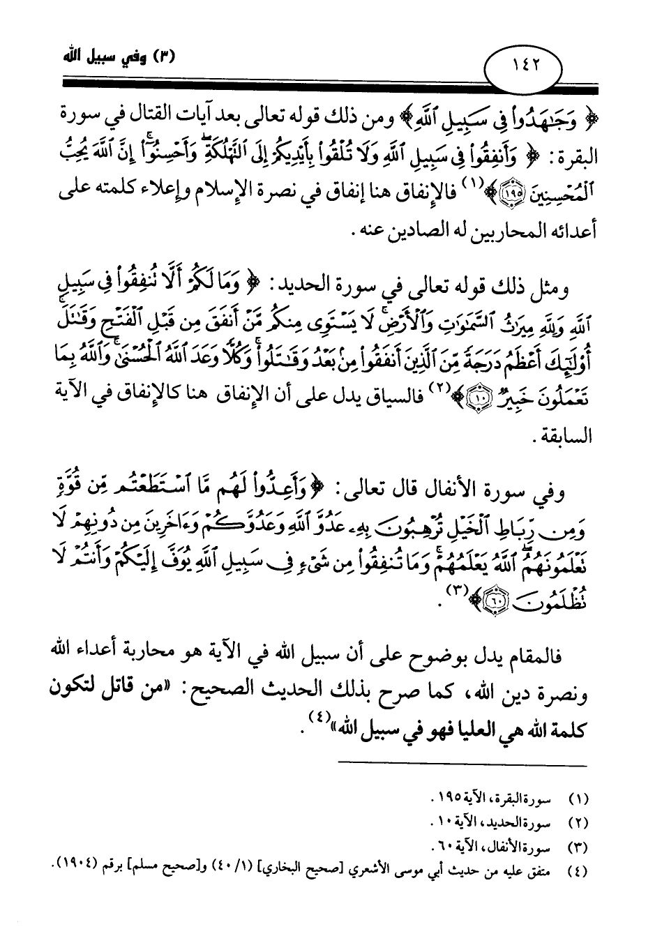 {وَجَاهَدُوا فِي سَبِيلِ اللَّهِ} (¬1) ومن ذلك قوله تعالى بعد آيات القتال في سورة البقرة: {وَأَنْفِقُوا فِي سَبِيلِ اللَّهِ وَلَا تُلْقُوا بِأَيْدِيكُمْ إِلَى التَّهْلُكَةِ وَأَحْسِنُوا إِنَّ اللَّهَ يُحِبُّ الْمُحْسِنِينَ} (¬2) فالإنفاق هنا إنفاق في نصرة الإسلام وإعلاء كلمته على أعدائه المحاربين له الصادين عنه.