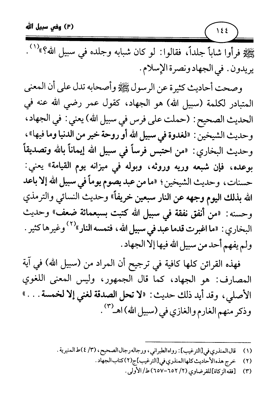 وصحت أحاديث كثيرة عن الرسول صلى الله عليه وسلم وأصحابه تدل على أن المعنى المتبادر لكلمة (سبيل الله) هو الجهاد، كقول عمر رضي الله عنه في الحديث الصحيح: (حملت على فرس في سبيل الله) يعني: في الجهاد، وحديث الشيخين: «لغدوة في سبيل الله أو روحة خير من الدنيا وما فيها (¬2) » ، وحديث البخاري: «من احتبس فرسا في سبيل الله إيمانا بالله وتصديقا بوعده، فإن شبعه وريه وروثه، وبوله في ميزانه يوم القيامة (¬3) » يعني: حسنات، وحديث الشيخين؛ «ما من عبد يصوم يوما في سبيل الله إلا باعد الله بذلك اليوم وجهه عن النار سبعين خريفا (¬4) » وحديث النسائي والترمذي وحسنه: «من أنفق نفقة في سبيل الله كتبت بسبعمائة ضعف (¬5) » وحديث البخاري: «ما اغبرت قدما عبد في سبيل الله، فتمسه النار (¬6) » (¬7) وغيرها كثير. ولم يفهم أحد من سبيل الله فيها إلا الجهاد.