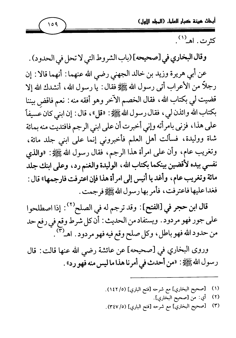 عن أبي هريرة وزيد بن خالد الجهني رضي الله عنهما: أنهما قالا: «إن رجلا من الأعراب أتى رسول الله صلى الله عليه وسلم فقال: يا رسول الله، أنشدك الله إلا قضيت لي بكتاب الله، فقال الخصم الآخر وهو أفقه منه: نعم فاقض بيننا بكتاب الله وائذن لي، فقال رسول الله صلى الله عليه وسلم: "قل"، قال: إن ابني كان عسيفا على هذا، فزنى بامرأته وإني أخبرت أن على ابني الرجم فافتديت منه بمائة شاة ووليدة، فسألت أهل العلم فأخبروني إنما على ابني جلد مائة، وتغريب عام، وأن على امرأة هذا الرجم، فقال رسول الله صلى الله عليه وسلم: "والذي نفسي بيده لأقضين بينكما بكتاب الله، الوليدة والغنم رد، وعلى ابنك جلد مائة وتغريب عام، واغد يا أنيس إلى امرأة هذا فإن اعترفت فارجمها" قال: فغدا عليها فاعترفت، فأمر بها رسول الله صلى الله عليه وسلم فرجمت (¬2) » .