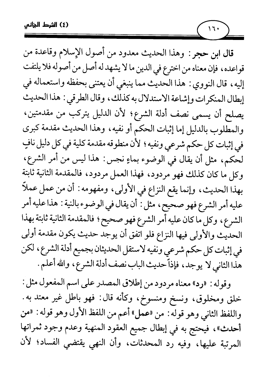 وإنما يقع النزاع في الأولى، ومفهومه: أن من عمل عملا عليه أمر الشرع فهو صحيح، مثل: أن يقال في الوضوء بالنية: هذا عليه أمر الشرع، وكل ما كان عليه أمر الشرع فهو صحيح؛ فالمقدمة الثانية ثابتة بهذا الحديث والأولى فيها النزاع فلو اتفق أن يوجد حديث يكون مقدمة أولى في إثبات كل حكم شرعي ونفيه لاستقل الحديثان بجميع أدلة الشرع، لكن هذا الثاني لا يوجد، فإذا حديث الباب نصف أدلة الشرع، والله أعلم.