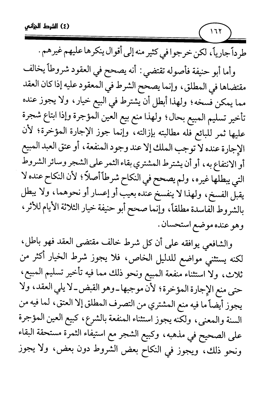 وأما أبو حنيفة فأصوله تقتضي: أنه يصحح في العقود شروطا يخالف مقتضاها في المطلق، وإنما يصحح الشرط في المعقود عليه إذا كان العقد مما يمكن فسخه؛ ولهذا أبطل أن يشترط في البيع خيار، ولا يجوز عنده تأخير تسليم المبيع بحال؛ ولهذا منع بيع العين المؤجرة وإذا ابتاع شجرة عليها ثمر للبائع فله مطالبته بإزالته