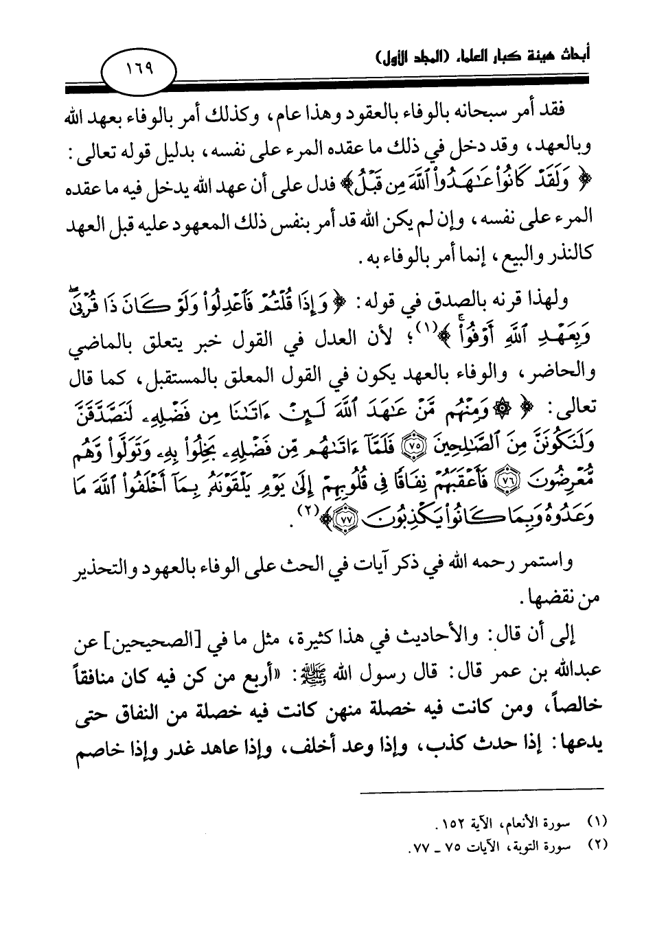 ولهذا قرنه بالصدق في قوله: {وَإِذَا قُلْتُمْ فَاعْدِلُوا وَلَوْ كَانَ ذَا قُرْبَى وَبِعَهْدِ اللَّهِ أَوْفُوا} (¬2) ؛ لأن العدل في القول خبر يتعلق بالماضي والحاضر، والوفاء بالعهد يكون في القول المعلق بالمستقبل، كما قال تعالى: {وَمِنْهُمْ مَنْ عَاهَدَ اللَّهَ لَئِنْ آتَانَا مِنْ فَضْلِهِ لَنَصَّدَّقَنَّ وَلَنَكُونَنَّ مِنَ الصَّالِحِينَ} (¬3) {فَلَمَّا آتَاهُمْ مِنْ فَضْلِهِ بَخِلُوا بِهِ وَتَوَلَّوْا وَهُمْ مُعْرِضُونَ} (¬4) {فَأَعْقَبَهُمْ نِفَاقًا فِي قُلُوبِهِمْ إِلَى يَوْمِ يَلْقَوْنَهُ بِمَا أَخْلَفُوا اللَّهَ مَا وَعَدُوهُ وَبِمَا كَانُوا يَكْذِبُونَ} (¬5) .