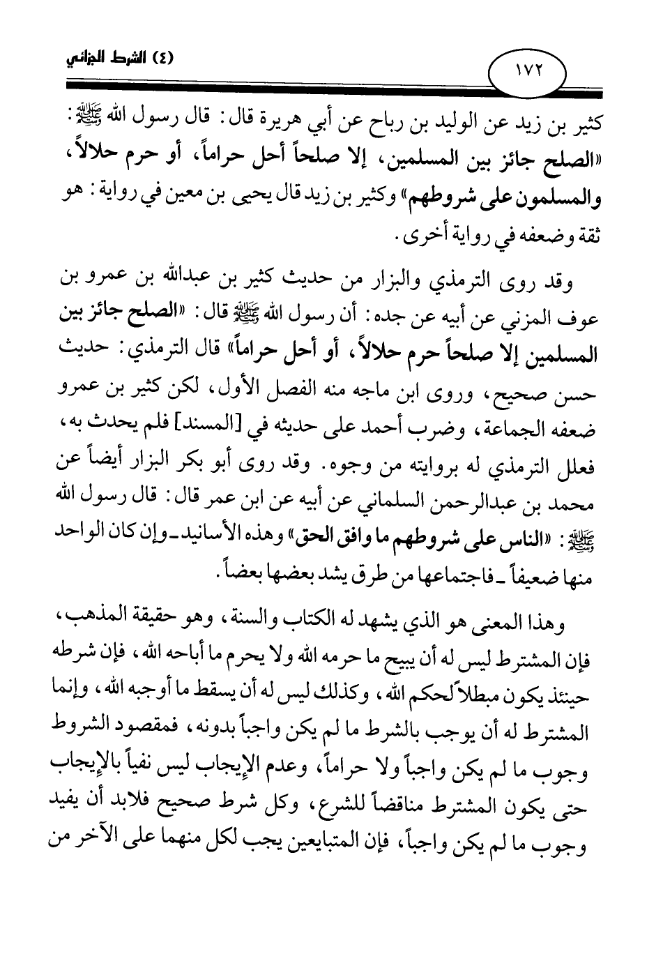وقد روى أبو بكر البزار أيضا عن محمد بن عبد الرحمن السلماني عن أبيه عن ابن عمر قال: قال رسول الله صلى الله عليه وسلم: «الناس على شروطهم ما وافق الحق» وهذه الأسانيد- وإن كان الواحد منها ضعيفا- فاجتماعها من طرق يشد بعضها بعضا.