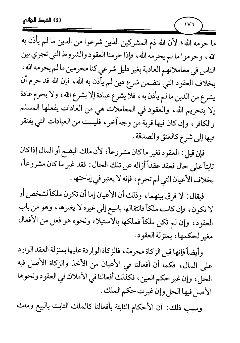 وأيضا فإنها قبل الزكاة محرمة، فالزكاة الواردة عليها بمنزلة العقد الوارد على المال، فكما أن أفعالنا في الأعيان من الأخذ والزكاة الأصل فيه الحل، وإن غير حكم العين، فكذلك أفعالنا في الأملاك في العقود ونحوها الأصل فيها الحل وإن غيرت حكم الملك.