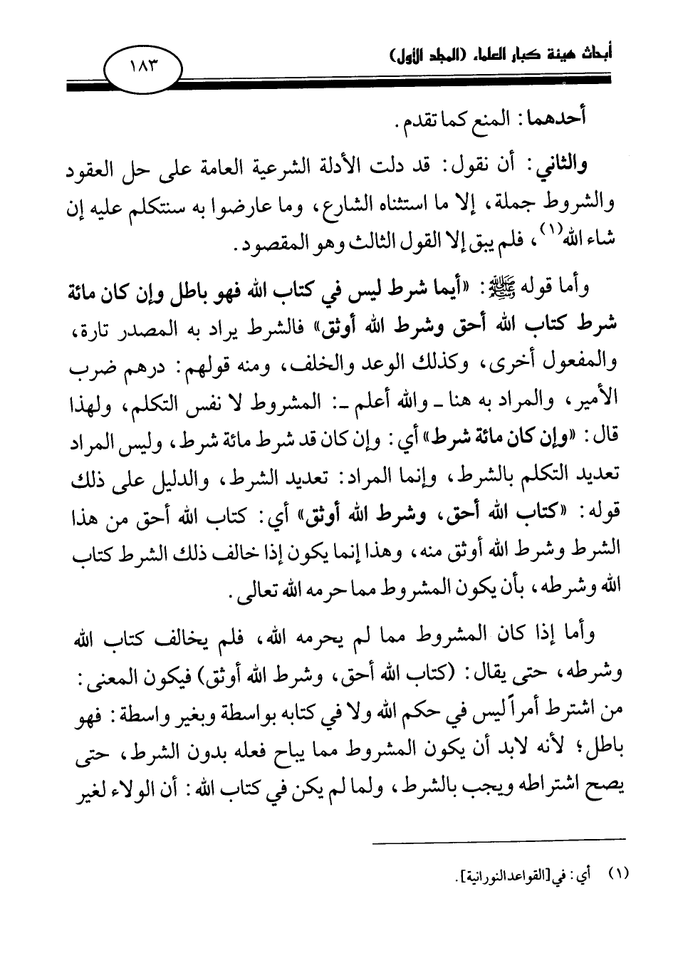 والثاني: أن نقول: قد دلت الأدلة الشرعية العامة على حل العقود والشروط جملة، إلا ما استثناه الشارع، وما عارضوا به سنتكلم عليه إن شاء الله (¬1) ، فلم يبق إلا القول الثالث وهو المقصود.