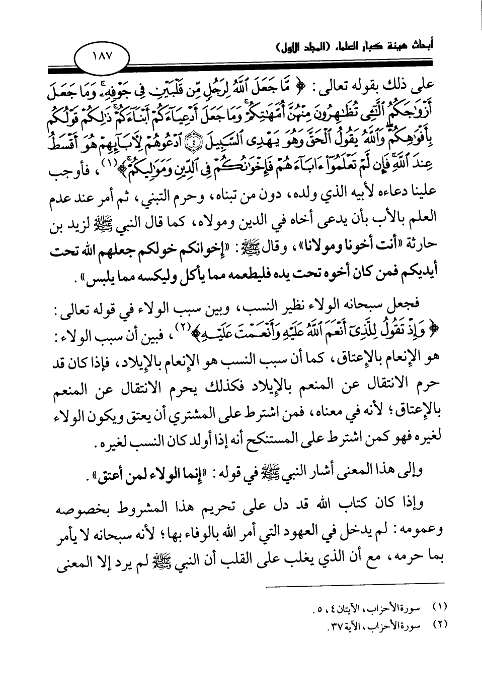 على ذلك بقوله تعالى: {مَا جَعَلَ اللَّهُ لِرَجُلٍ مِنْ قَلْبَيْنِ فِي جَوْفِهِ وَمَا جَعَلَ أَزْوَاجَكُمُ اللَّائِي تُظَاهِرُونَ مِنْهُنَّ أُمَّهَاتِكُمْ وَمَا جَعَلَ أَدْعِيَاءَكُمْ أَبْنَاءَكُمْ ذَلِكُمْ قَوْلُكُمْ بِأَفْوَاهِكُمْ وَاللَّهُ يَقُولُ الْحَقَّ وَهُوَ يَهْدِي السَّبِيلَ} (¬1) {ادْعُوهُمْ لِآبَائِهِمْ هُوَ أَقْسَطُ عِنْدَ اللَّهِ فَإِنْ لَمْ تَعْلَمُوا آبَاءَهُمْ فَإِخْوَانُكُمْ فِي الدِّينِ وَمَوَالِيكُمْ} (¬2) فأوجب علينا دعاءه لأبيه الذي ولده، دون من تبناه، وحرم التبني، ثم أمر عند عدم العلم بالأب بأن يدعى أخاه في الدين ومولاه، كما «قال النبي صلى الله عليه وسلم لزيد بن حارثة أنت أخونا ومولانا (¬3) » ، وقال صلى الله عليه وسلم: «إخوانكم خولكم جعلهم الله تحت أيديكم فمن كان أخوه تحت يده فليطعمه مما يأكل وليكسه مما يلبس (¬4) » .