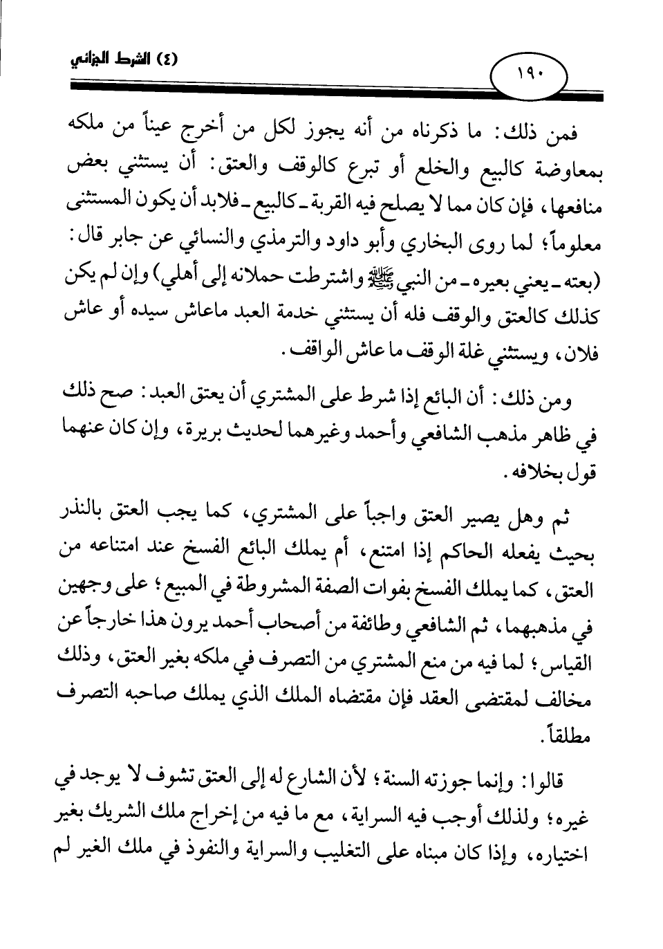 ومن ذلك: أن البائع إذا شرط على المشتري أن يعتق العبد: صح ذلك في ظاهر مذهب الشافعي وأحمد وغيرهما لحديث بريرة، وإن كان عنهما قول بخلافه.