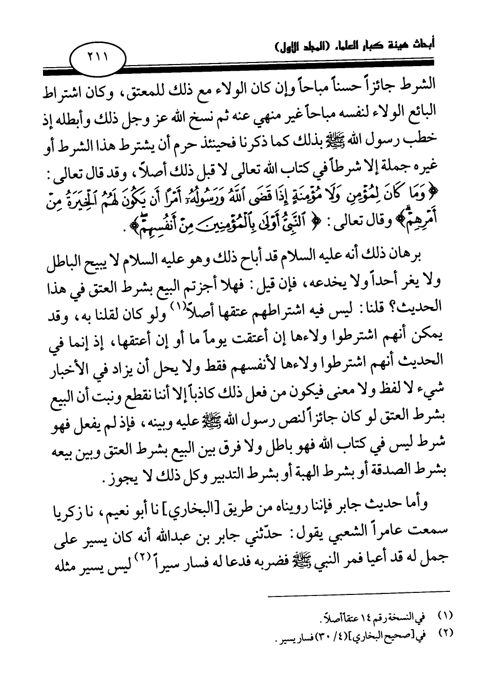 الشرط جائزا حسنا مباحا وإن كان الولاء مع ذلك للمعتق، وكان اشتراط البائع الولاء لنفسه مباحا غير منهي عنه ثم نسخ الله عز وجل ذلك وأبطله إذ خطب رسول الله صلى الله عليه وسلم بذلك كما ذكرنا فحينئذ حرم أن يشترط هذا الشرط أو غيره جملة إلا شرطا في كتاب الله تعالى لا قبل ذلك أصلا، وقد قال تعالى: {وَمَا كَانَ لِمُؤْمِنٍ وَلَا مُؤْمِنَةٍ إِذَا قَضَى اللَّهُ وَرَسُولُهُ أَمْرًا أَنْ يَكُونَ لَهُمُ الْخِيَرَةُ مِنْ أَمْرِهِمْ} (¬1) وقال تعالى: {النَّبِيُّ أَوْلَى بِالْمُؤْمِنِينَ مِنْ أَنْفُسِهِمْ} (¬2)