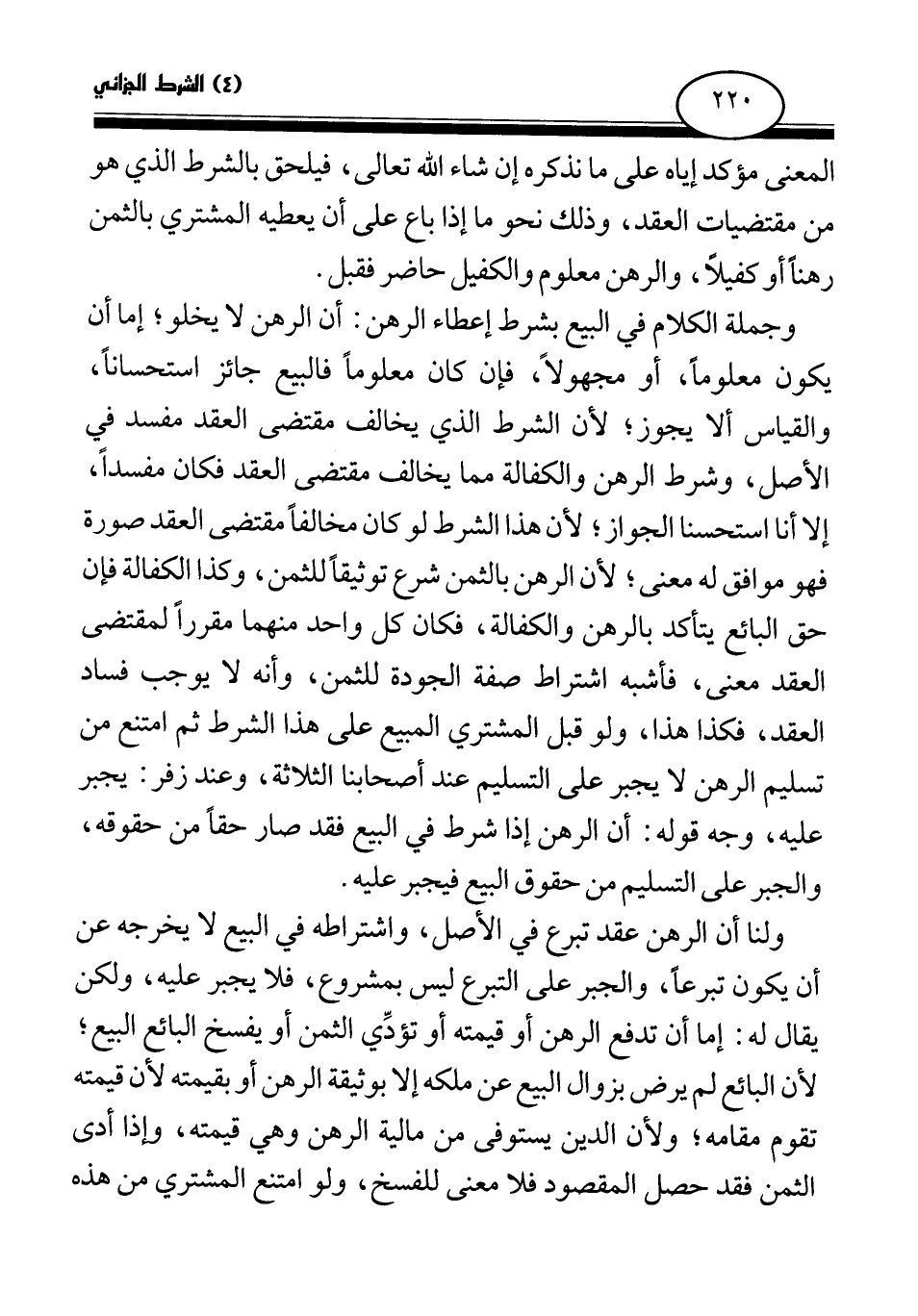 ولنا أن الرهن عقد تبرع في الأصل، واشتراطه في البيع لا يخرجه عن أن يكون تبرعا، والجبر على التبرع ليس بمشروع، فلا يجبر عليه، ولكن يقال له: إما أن تدفع الرهن أو قيمته أو تؤدي الثمن أو يفسخ البائع البيع؛ لأن البائع لم يرض بزوال البيع عن ملكه إلا بوثيقة الرهن أو بقيمته لأن قيمته تقوم مقامه؛ ولأن الدين يستوفى من مالية الرهن وهي قيمته، وإذا أدى الثمن فقد حصل المقصود فلا معنى للفسخ، ولو امتنع المشتري من هذه