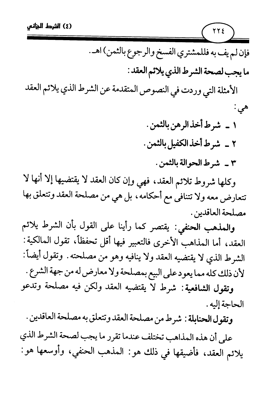 والمذهب الحنفي: يقتصر كما رأينا على القول بأن الشرط يلائم العقد، أما المذاهب الأخرى فالتعبير فيها أقل تحفظا، تقول المالكية: الشرط الذي لا يقتضيه العقد ولا ينافيه وهو من مصلحته. وتقول أيضا: لأن ذلك كله مما يعود على البيع بمصلحة ولا معارض له من جهة الشرع.