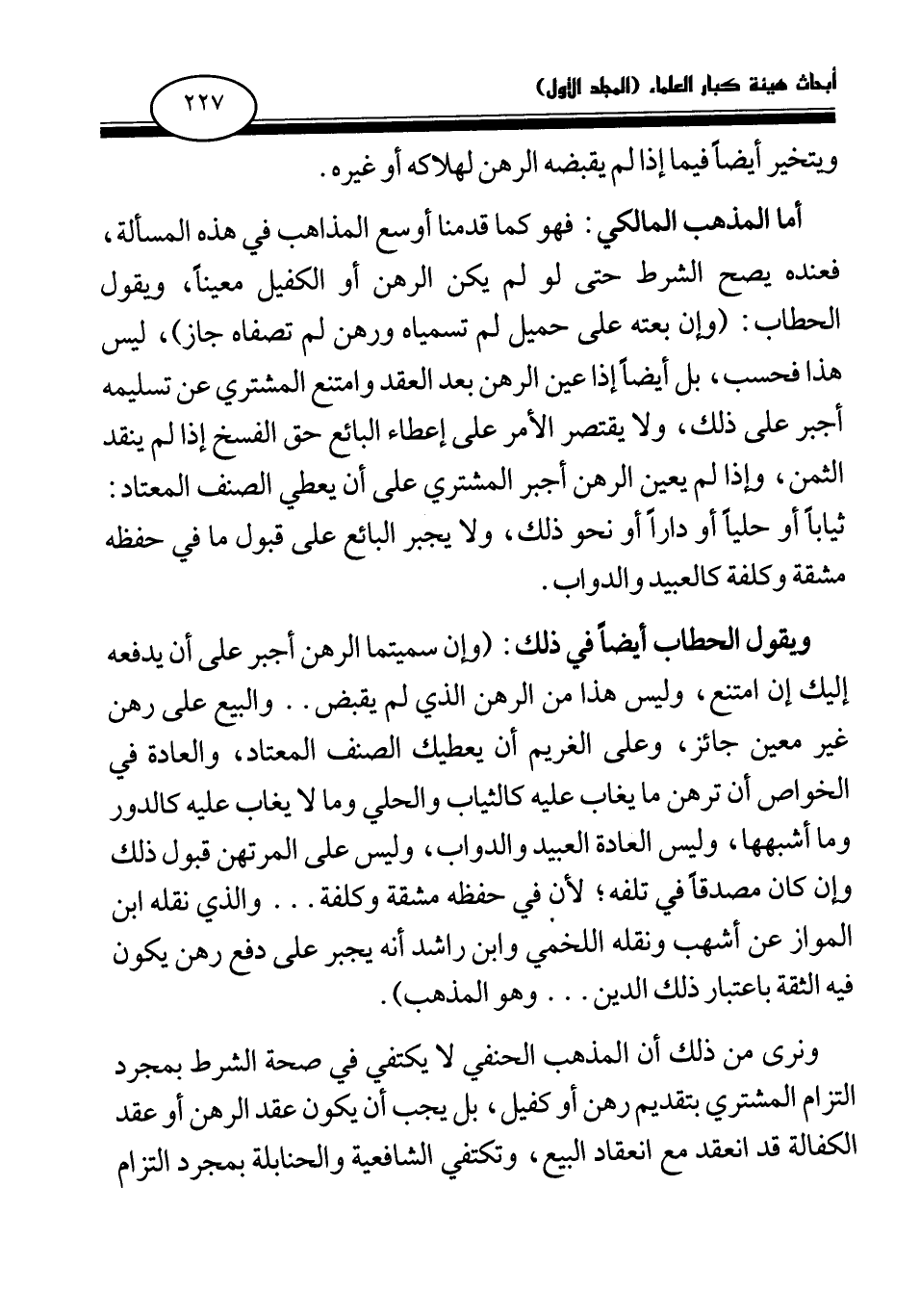 أما المذهب المالكي: فهو كما قدمنا أوسع المذاهب في هذه المسألة، فعنده يصح الشرط حتى لو لم يكن الرهن أو الكفيل معينا، ويقول الحطاب: (وإن بعته على حميل لم تسمياه ورهن لم تصفاه جاز) ، ليس هذا فحسب، بل أيضا إذا عين الرهن بعد العقد وامتنع المشتري عن تسليمه أجبر على ذلك، ولا يقتصر الأمر على إعطاء البائع حق الفسخ إذا لم ينقد الثمن، وإذا لم يعين الرهن أجبر المشتري على أن يعطي الصنف المعتاد: ثيابا أو حليا أو دارا أو نحو ذلك، ولا يجبر البائع على قبول ما في حفظه مشقة وكلفة كالعبيد والدواب.