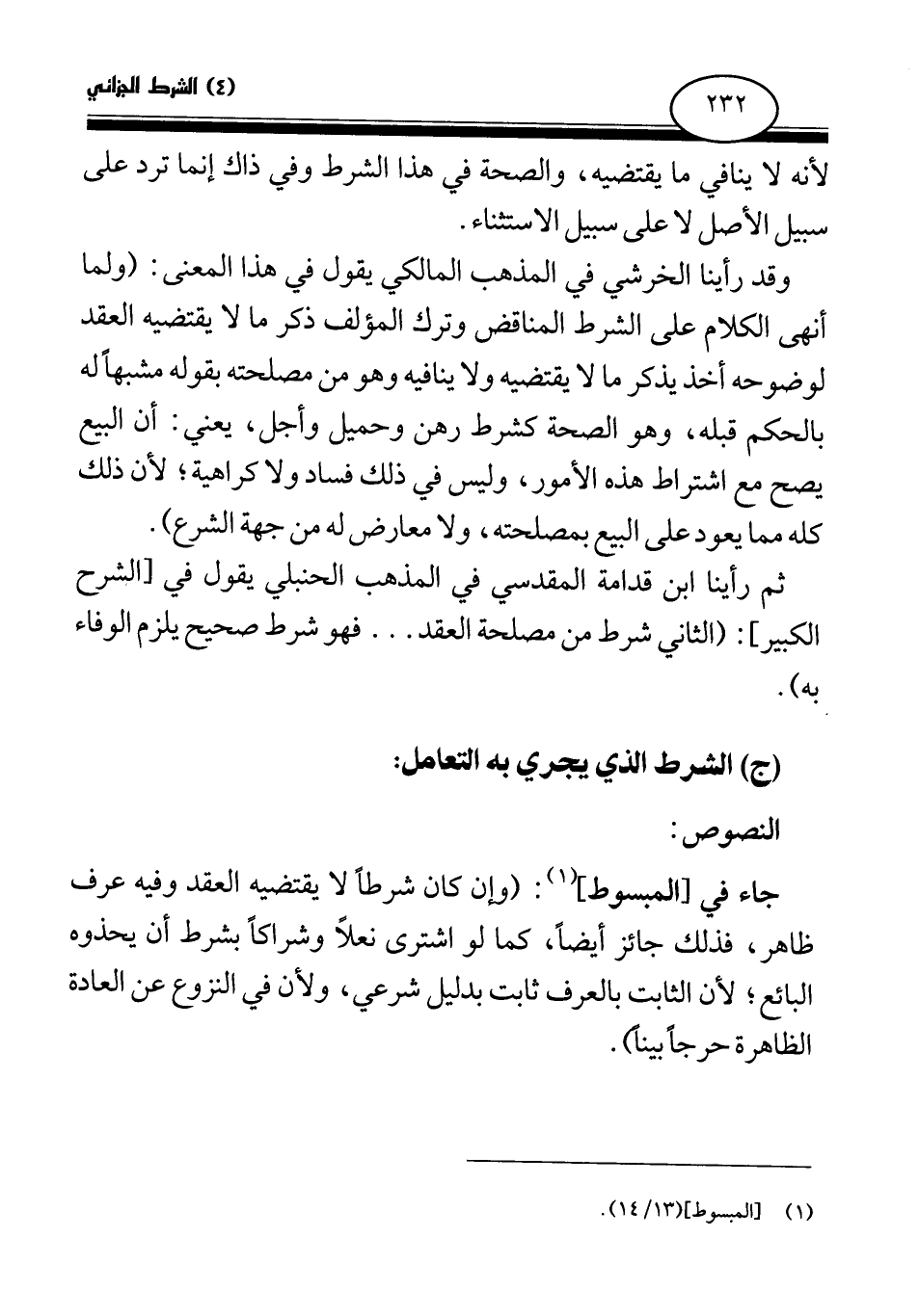 وقد رأينا الخرشي في المذهب المالكي يقول في هذا المعنى: (ولما أنهى الكلام على الشرط المناقض وترك المؤلف ذكر ما لا يقتضيه العقد لوضوحه أخذ يذكر ما لا يقتضيه ولا ينافيه وهو من مصلحته بقوله مشبها له بالحكم قبله، وهو الصحة كشرط رهن وحميل وأجل، يعني: أن البيع يصح مع اشتراط هذه الأمور، وليس في ذلك فساد ولا كراهية، لأن ذلك كله مما يعود على البيع بمصلحته، ولا معارض له من جهة الشرع) .