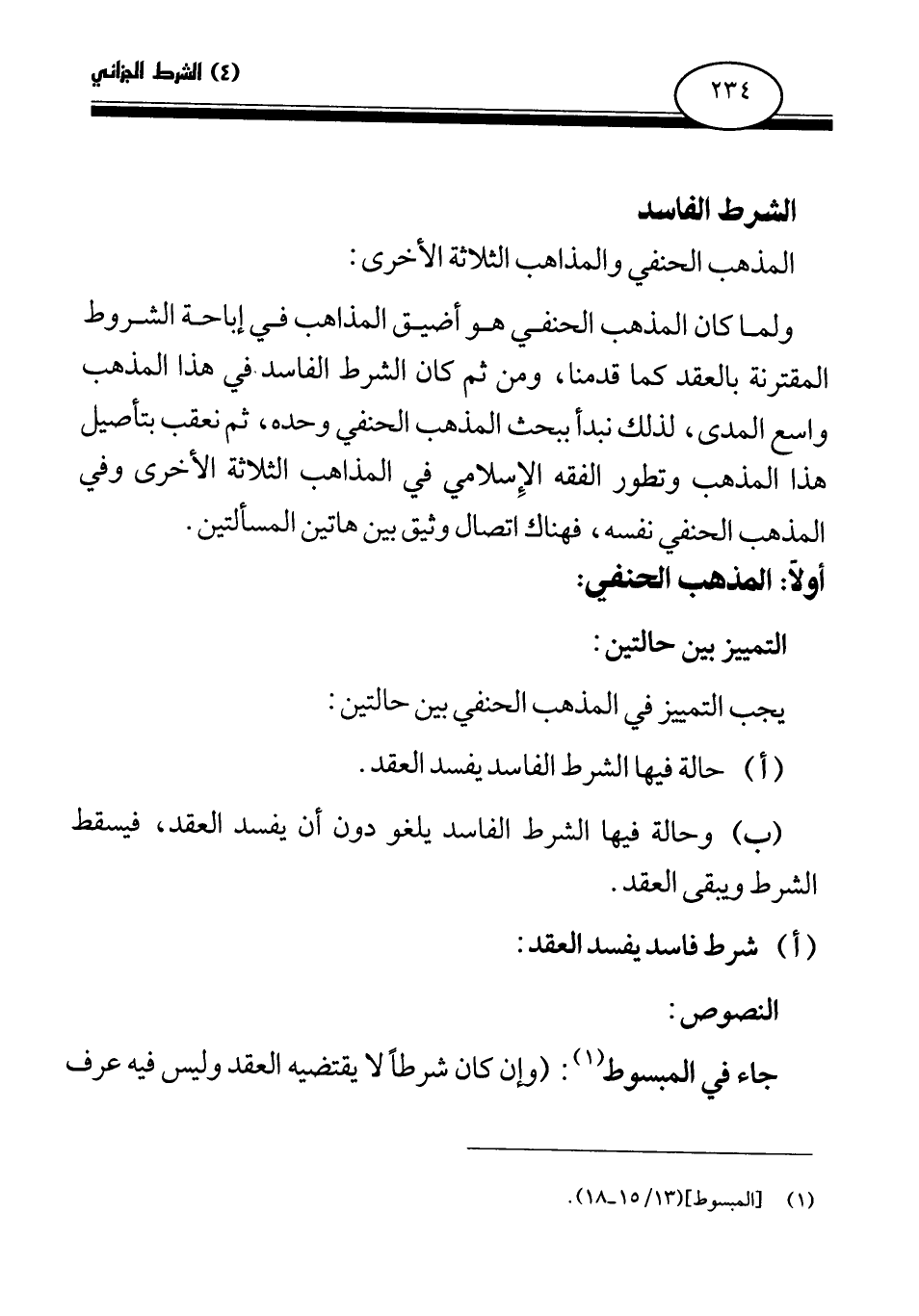 ولما كان المذهب الحنفي هو أضيق المذاهب في إباحة الشروط المقترنة بالعقد كما قدمنا، ومن ثم كان الشرط الفاسد في هذا المذهب واسع المدى، لذلك نبدأ ببحث المذهب الحنفي وحده، ثم نعقب بتأصيل هذا المذهب وتطور الفقه الإسلامي في المذاهب الثلاثة الأخرى وفي المذهب الحنفي نفسه، فهناك اتصال وثيق بين هاتين المسألتين.