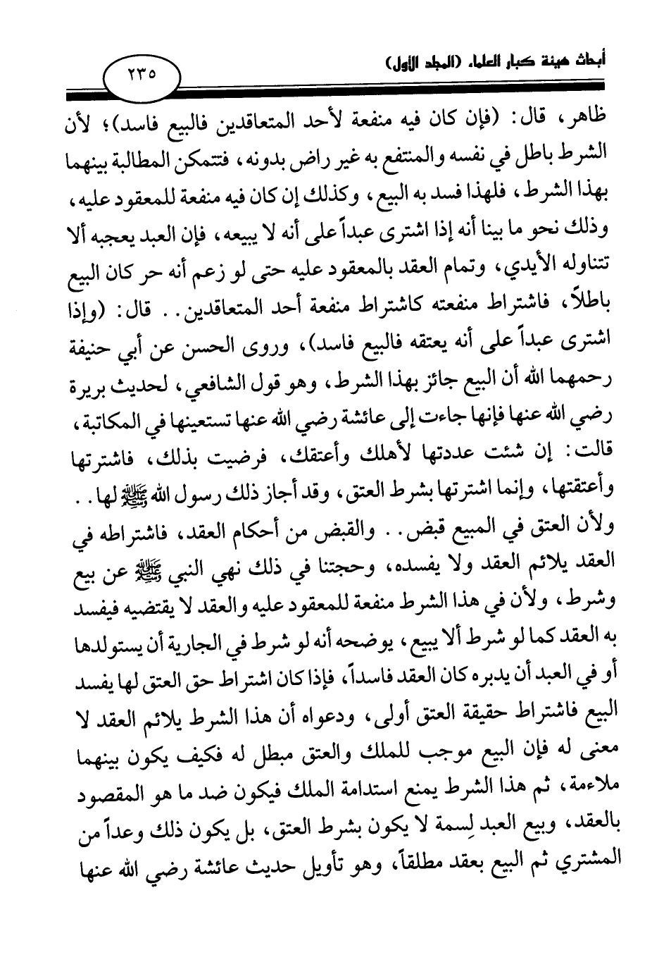 ظاهر، قال: (فإن كان فيه منفعة لأحد المتعاقدين فالبيع فاسد) ؛ لأن الشرط باطل في نفسه والمنتفع به غير راض بدونه، فتتمكن المطالبة بينهما بهذا الشرط، فلهذا فسد به البيع، وكذلك إن كان فيه منفعة للمعقود عليه، وذلك نحو ما بينا أنه إذا اشترى عبدا على أنه لا يبيعه، فإن العبد يعجبه ألا تتناوله الأيدي، وتمام العقد بالمعقود عليه حتى لو زعم أنه حر كان البيع باطلا، فاشتراط منفعته كاشتراط منفعة أحد المتعاقدين.. قال: (وإذا اشترى عبدا على أنه يعتقه فالبيع فاسد) ، وروى الحسن عن أبي حنيفة رحمهما الله أن البيع جائز بهذا الشرط، وهو قول الشافعي، لحديث بريرة رضي الله عنها فإنها جاءت إلى عائشة رضي الله عنها تستعينها في المكاتبة، قالت: إن شئت عددتها لأهلك وأعتقك، فرضيت بذلك، فاشترتها وأعتقتها، وإنما اشترتها بشرط العتق، وقد أجاز ذلك رسول الله صلى الله عليه وسلم لها.. ولأن العتق في المبيع قبض.. والقبض من أحكام العقد، فاشتراطه في العقد يلائم العقد ولا يفسده، وحجتنا في ذلك نهي النبي صلى الله عليه وسلم عن بيع وشرط، ولأن في هذا الشرط منفعة للمعقود عليه والعقد لا يقتضيه فيفسد به العقد كما لو شرط ألا يبيع، يوضحه أنه لو شرط في الجارية أن يستولدها أو في العبد أن يدبره كان العقد فاسدا، فإذا كان اشتراط حق العتق لها يفسد البيع فاشتراط حقيقة العتق أولى، ودعواه أن هذا الشرط يلائم العقد لا معنى له فإن البيع موجب للملك والعتق مبطل له فكيف يكون بينهما ملاءمة، ثم هذا الشرط يمنع استدامة الملك فيكون ضد ما هو المقصود بالعقد، وبيع العبد لسمة لا يكون بشرط العتق، بل يكون ذلك وعدا من المشتري ثم البيع بعقد مطلقا، وهو تأويل حديث عائشة رضي الله عنها