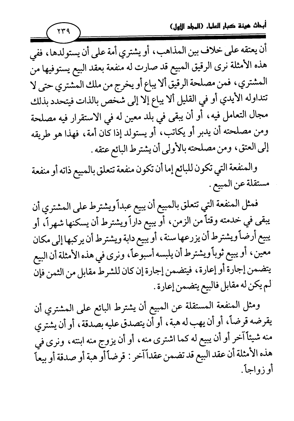 أن يعتقه على خلاف بين المذاهب، أو يشتري أمة على أن يستولدها، ففي هذه الأمثلة نرى الرقيق المبيع قد صارت له منفعة بعقد البيع يستوفيها من المشتري، فمن مصلحة الرقيق ألا يباع أو يخرج من ملك المشتري حتى لا تتداوله الأيدي أو في القليل ألا يباع إلا إلى شخص بالذات فيتحدد بذلك مجال التعامل فيه، أو أن يبقى في بلد معين له في الاستقرار فيه مصلحة ومن مصلحته أن يدبر أو يكاتب، أو يستولد إذا كان أمة، فهذا هو طريقه إلى العتق، ومن مصلحته بالأولى أن يشترط البائع عتقه.