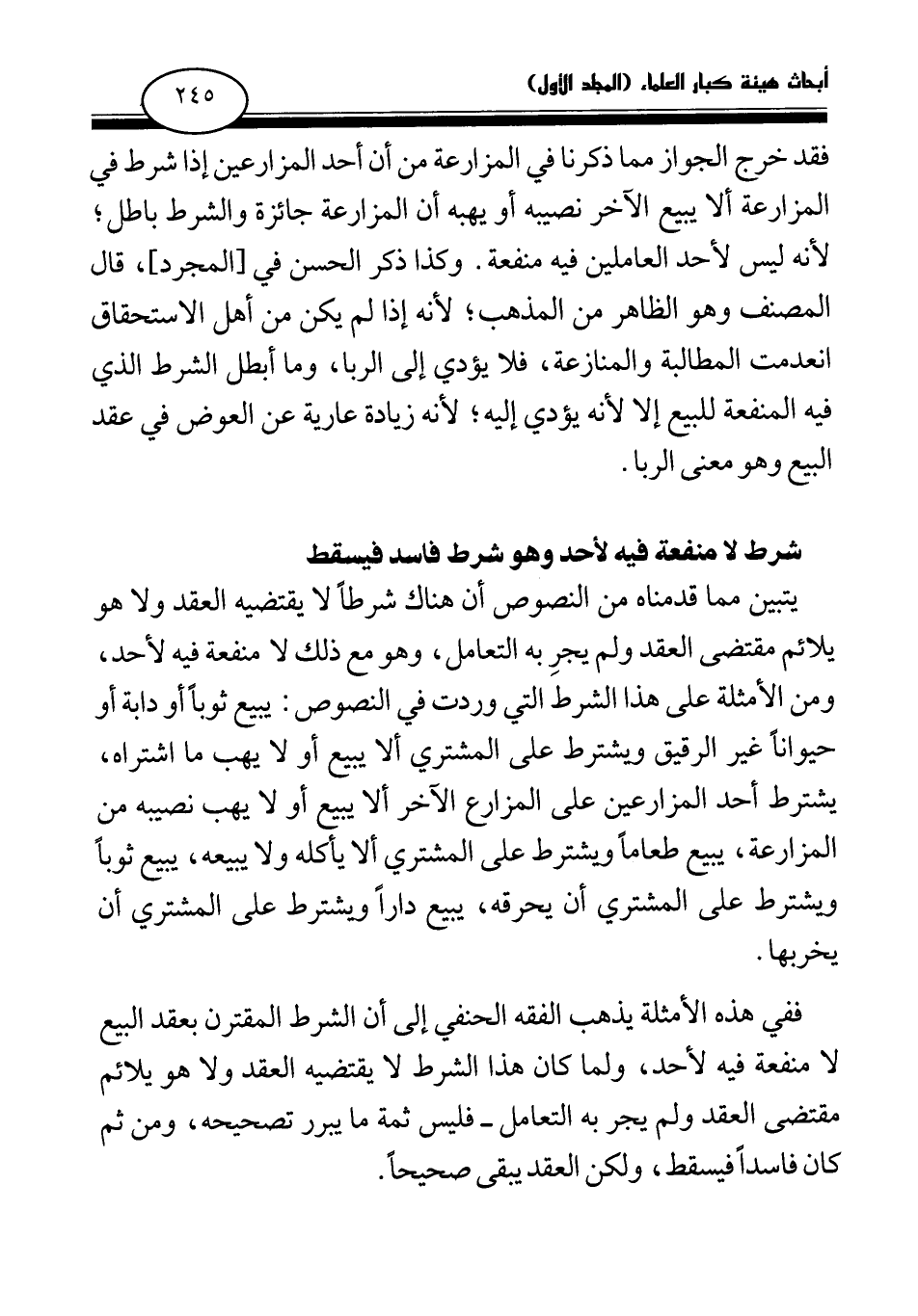 يتبين مما قدمناه من النصوص أن هناك شرطا لا يقتضيه العقد ولا هو يلائم مقتضى العقد ولم يجر به التعامل، وهو مع ذلك لا منفعة فيه لأحد، ومن الأمثلة على هذا الشرط التي وردت في النصوص: يبيع ثوبا أو دابة أو حيوانا غير الرقيق ويشترط على المشتري ألا يبيع أو لا يهب ما اشتراه، يشترط أحد المزارعين على المزارع الآخر ألا يبيع أو لا يهب نصيبه من المزارعة، يبيع طعاما ويشترط على المشتري ألا يأكله ولا يبيعه، يبيع ثوبا ويشترط على المشتري أن يحرقه، يبيع دارا ويشترط على المشتري أن يخربها.