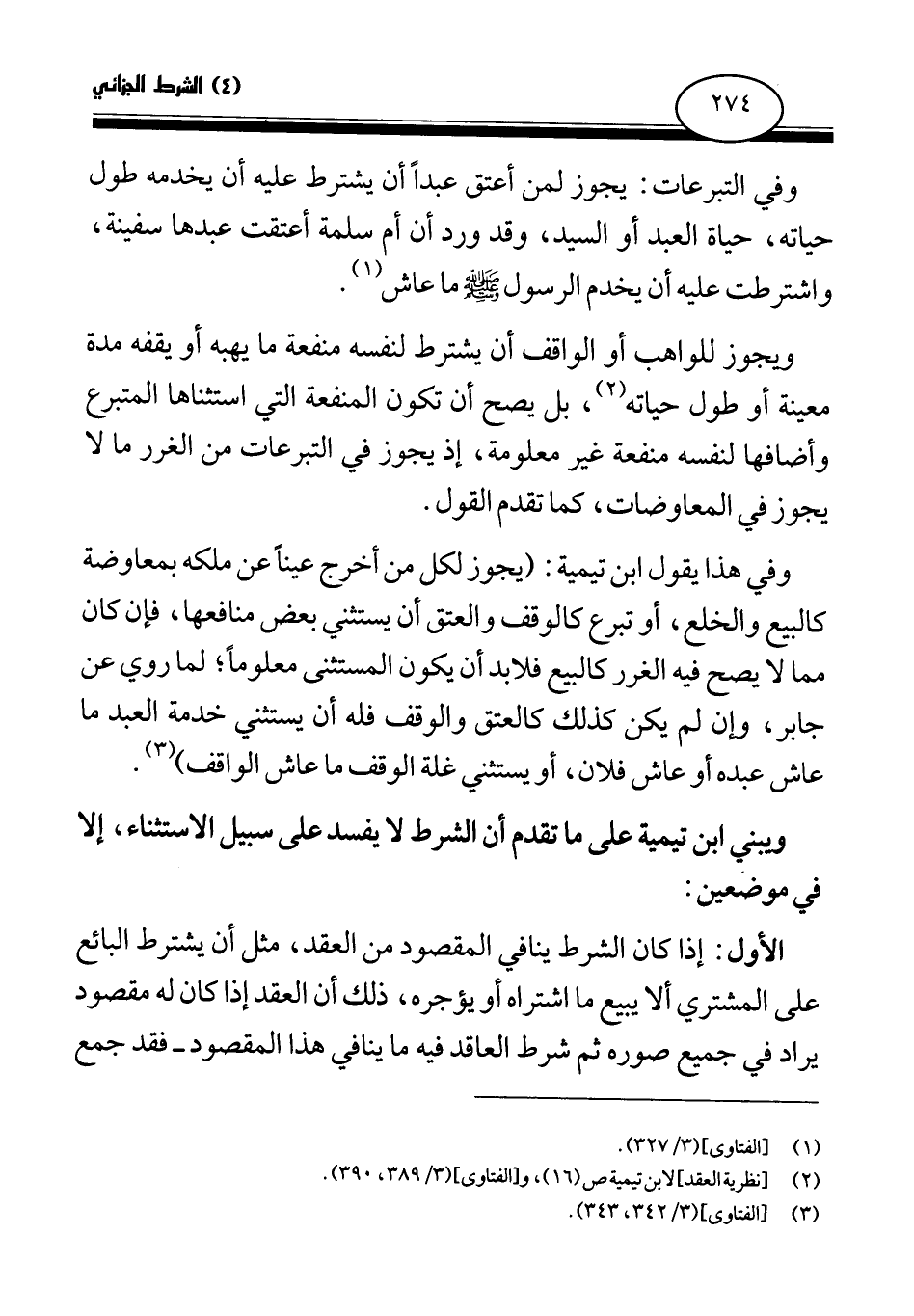 وفي هذا يقول ابن تيمية: (يجوز لكل من أخرج عينا عن ملكه بمعاوضة كالبيع والخلع، أو تبرع كالوقف والعتق أن يستثني بعض منافعها، فإن كان مما لا يصح فيه الغرر كالبيع فلا بد أن يكون المستثنى معلوما، لما روي عن جابر، وإن لم يكن كذلك كالعتق والوقف فله أن يستثني خدمة العبد ما عاش عبده أو عاش فلان، أو يستثني غلة الوقف ما عاش الواقف) (¬3) .